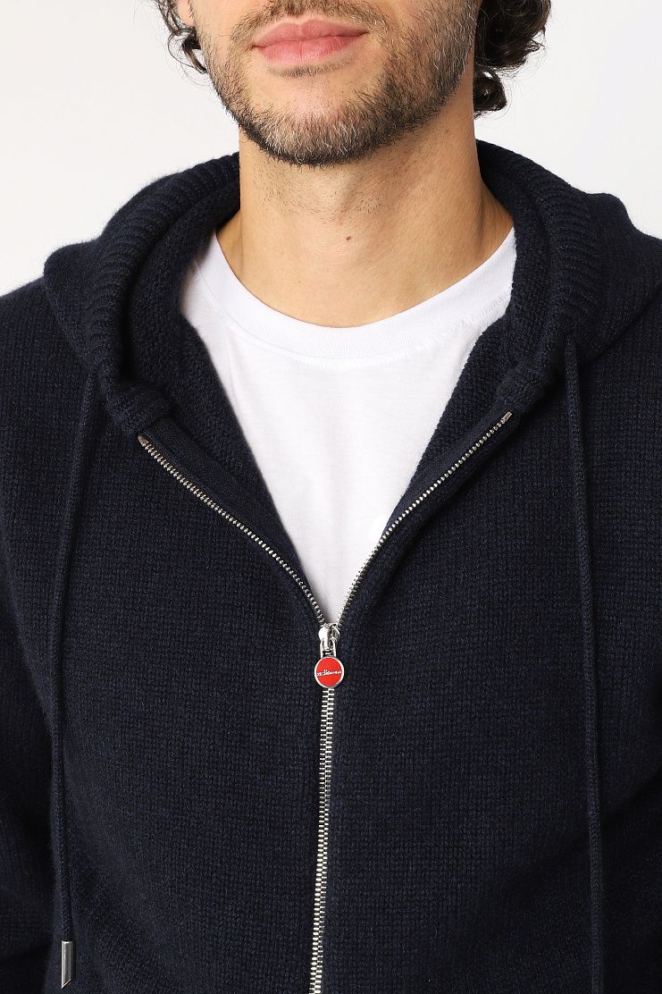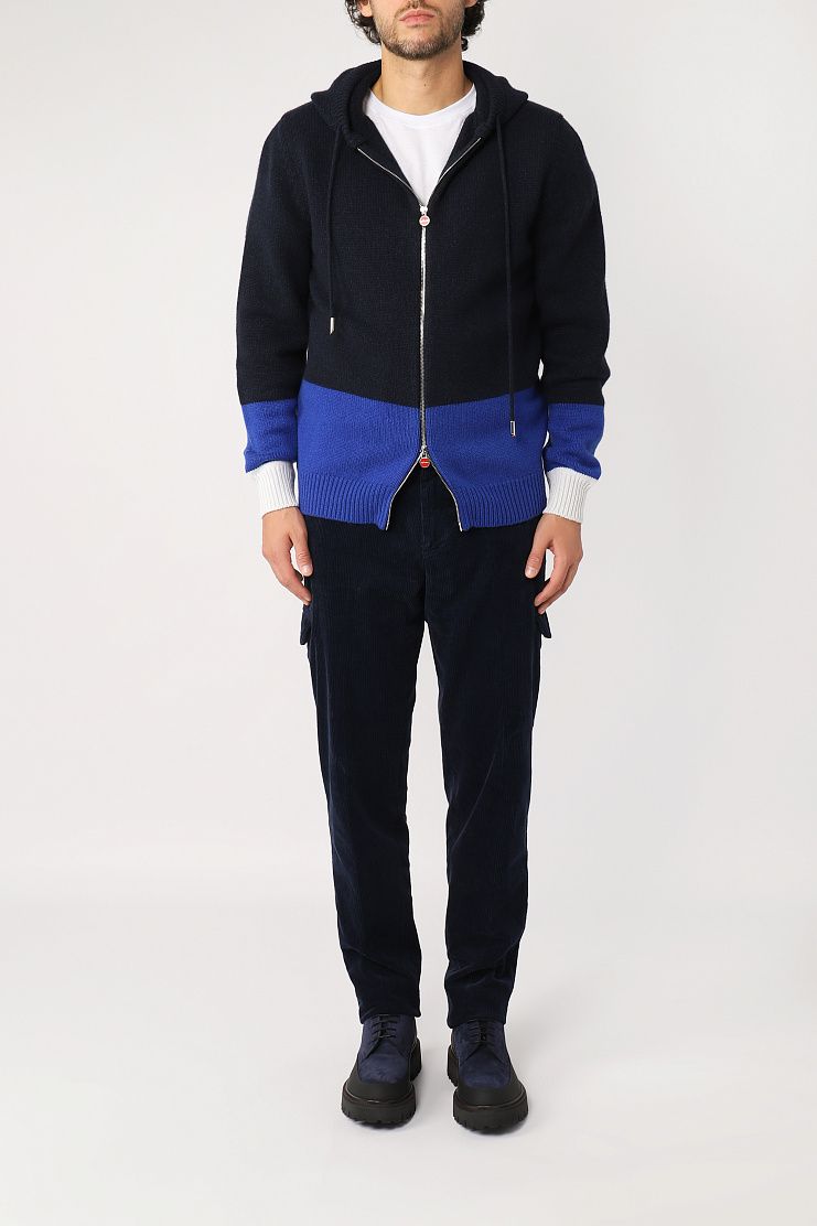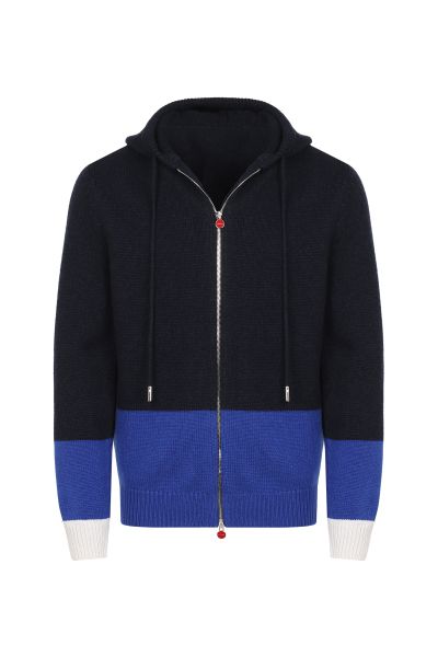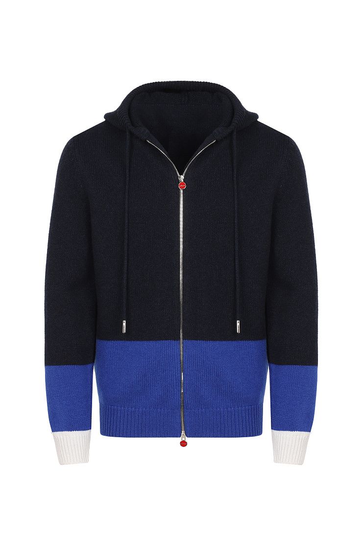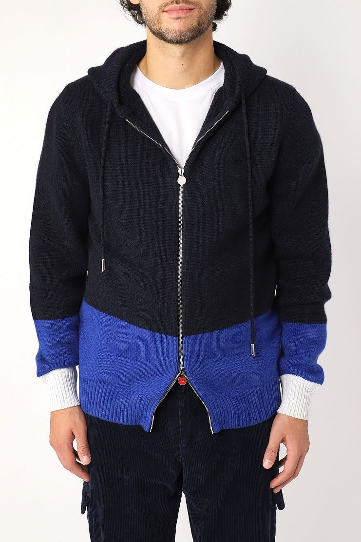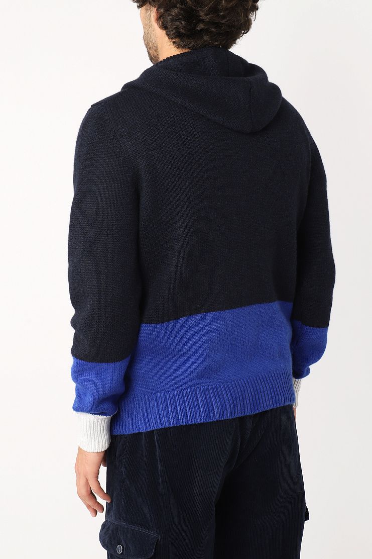 Трикотажный кардиган из тонкой кашемировой пряжи выполнили в технике color block. Модель с капюшоном застегивается на встречную молнию с брендированными пуллерами.