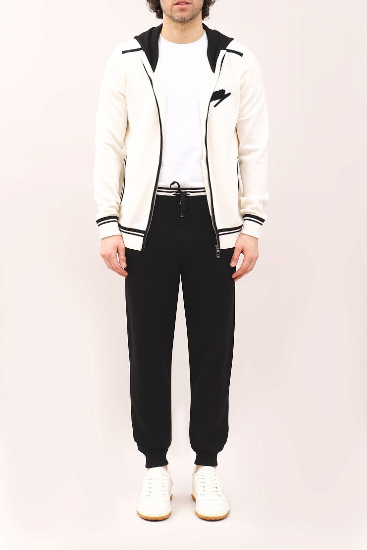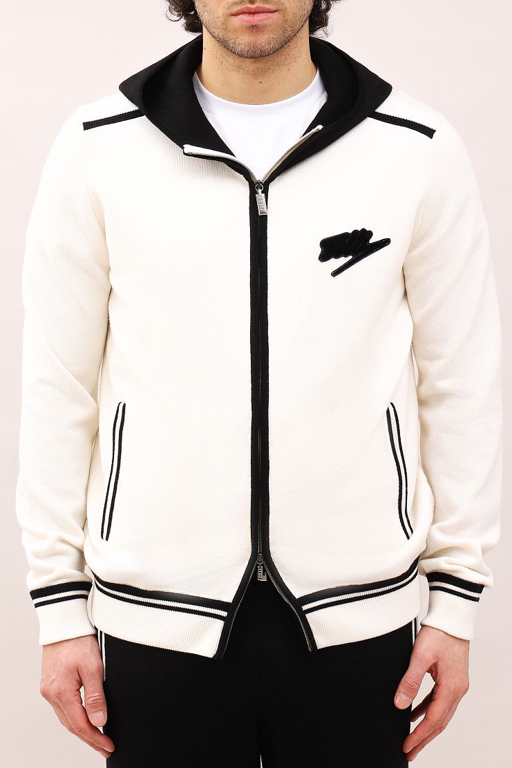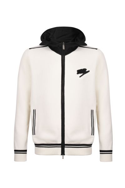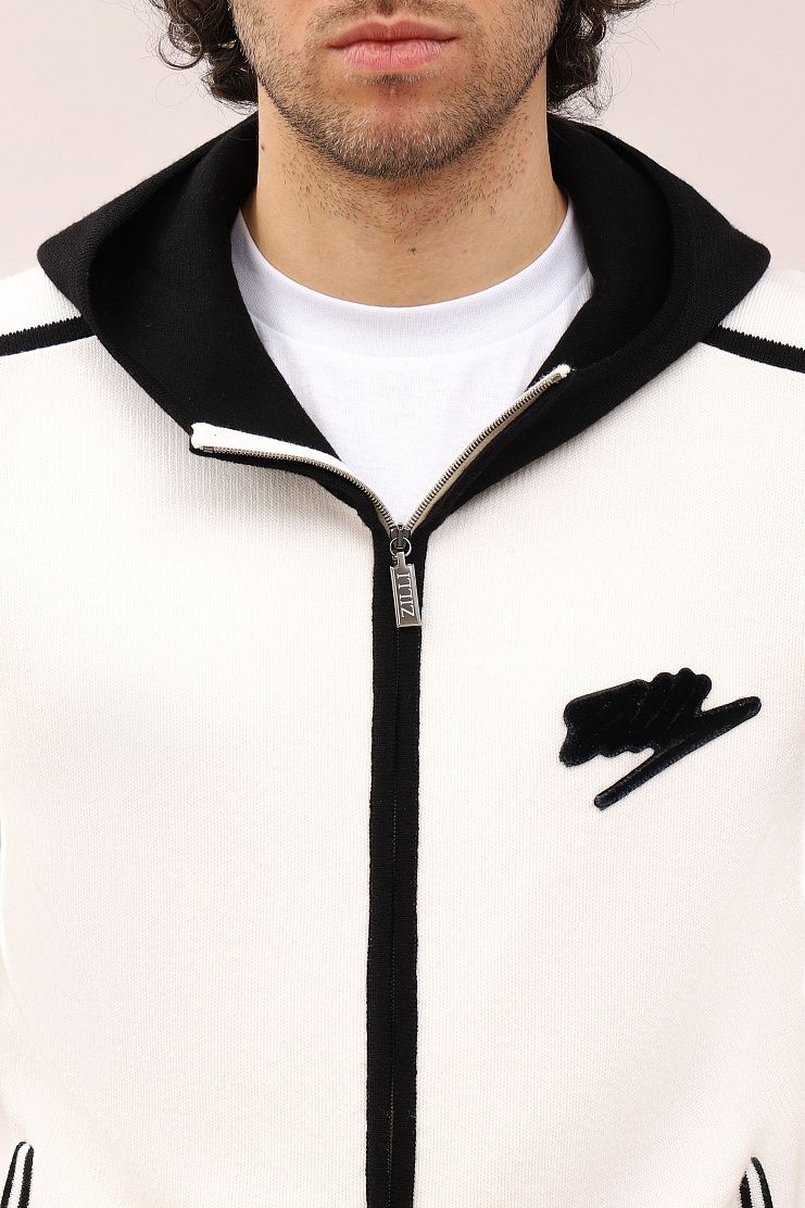Толстовка с контрастными деталями по линии плеч, на карманах и манжетах и нашивкой в виде прописного логотипа Zilli на груди. Модель имеет черный капюшон, боковые карманы и застежку на молнии.