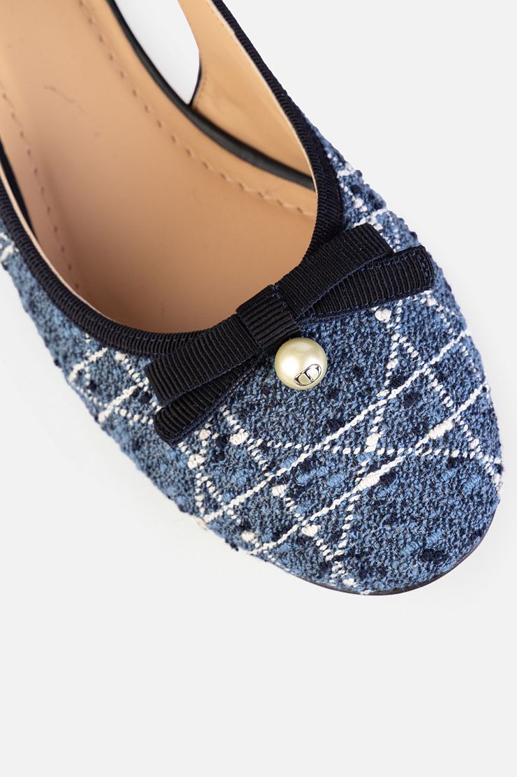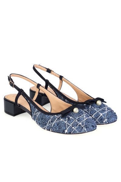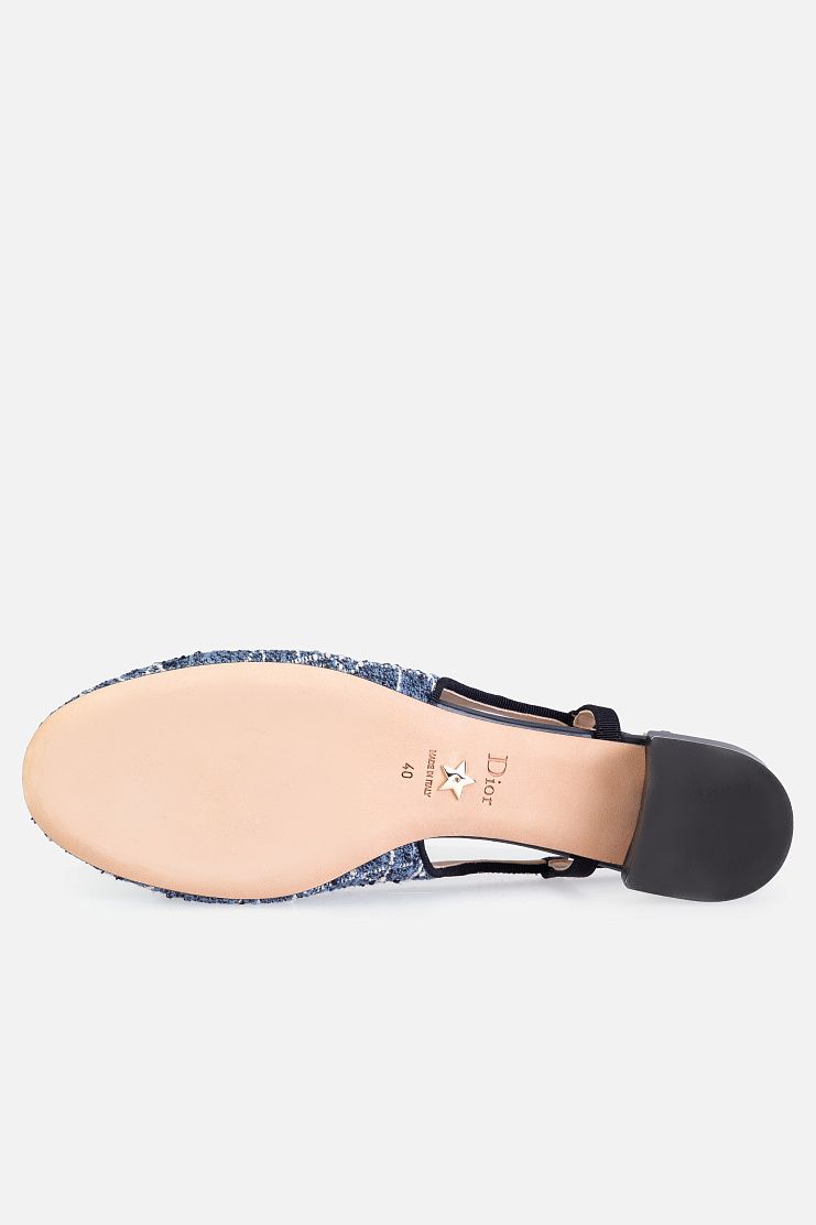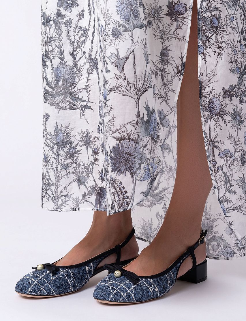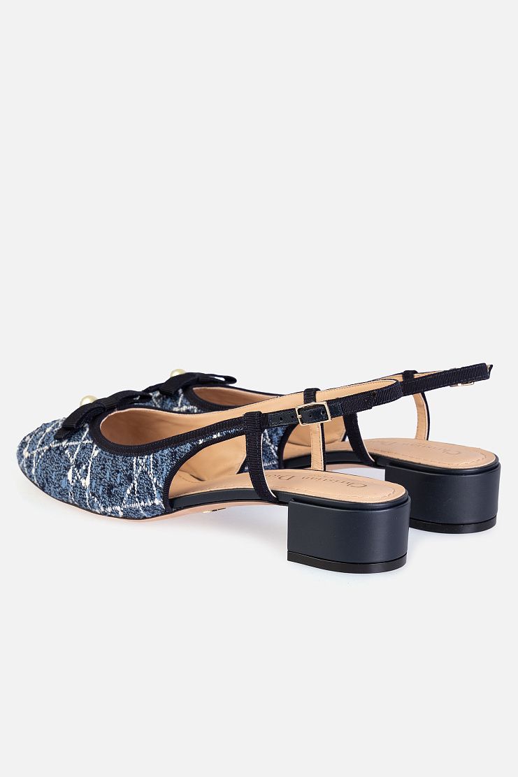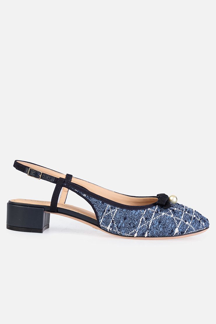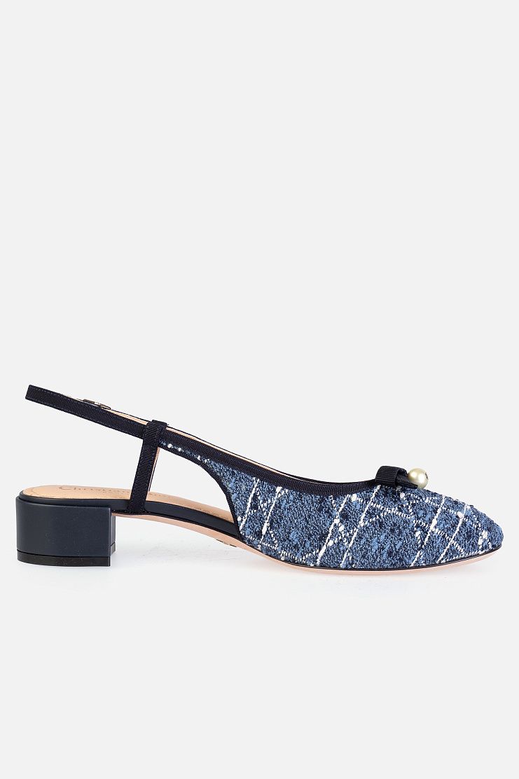 Слингбэки на небольшом блочном каблуке выполнили из фактурного твида c мотивом Cannage. Модель с закругленным мысом украсили контрастной окантовкой, лаконичным бантом из репса и жемчужиной. В комплекте — пыльник для хранения.