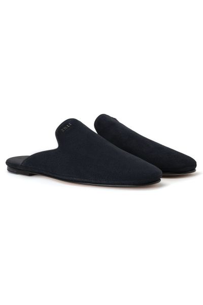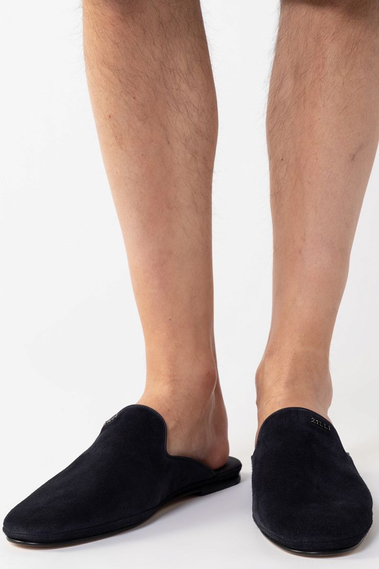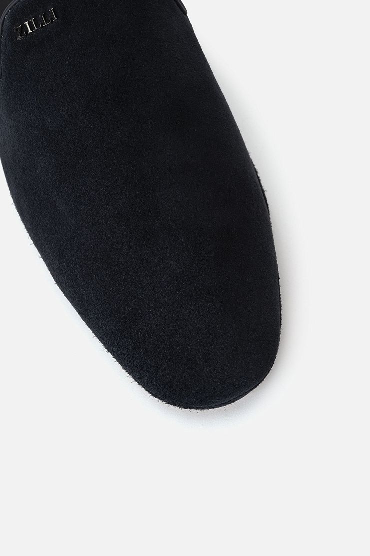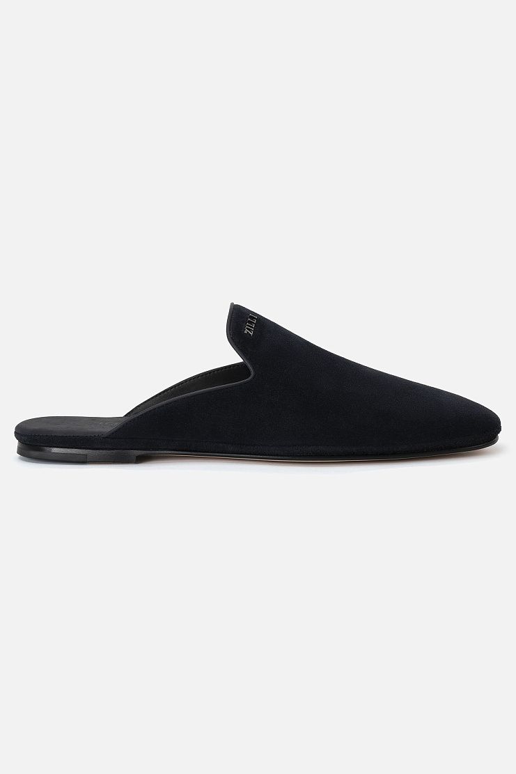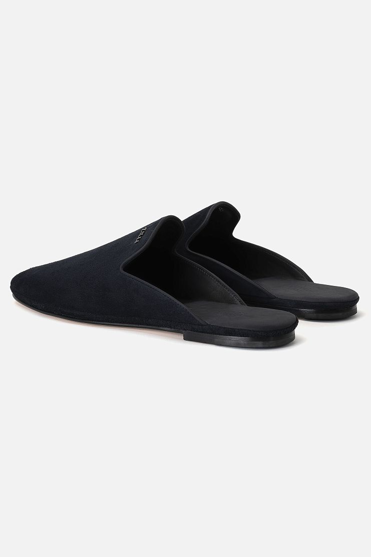 Туфли с открытой пяткой выполнили из мягкой и бархатистой замши. Модель на тонкой подошве дополнена фигурным вырезом и украшена серебристым логотипом.