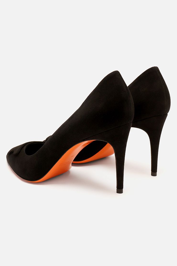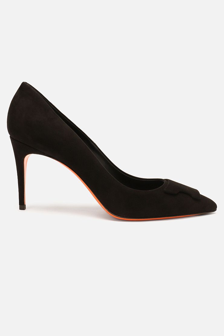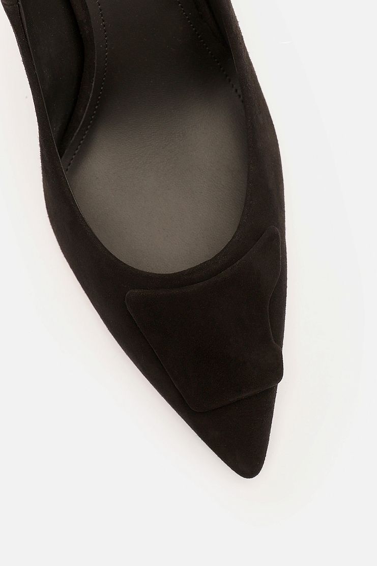 Замшевые туфли на каблуке-шпильке прекрасно дополнят любой повседневный образ. Модель с заостренным мысом украшена деталью, напоминающей по форме перемычку фирменных монков.