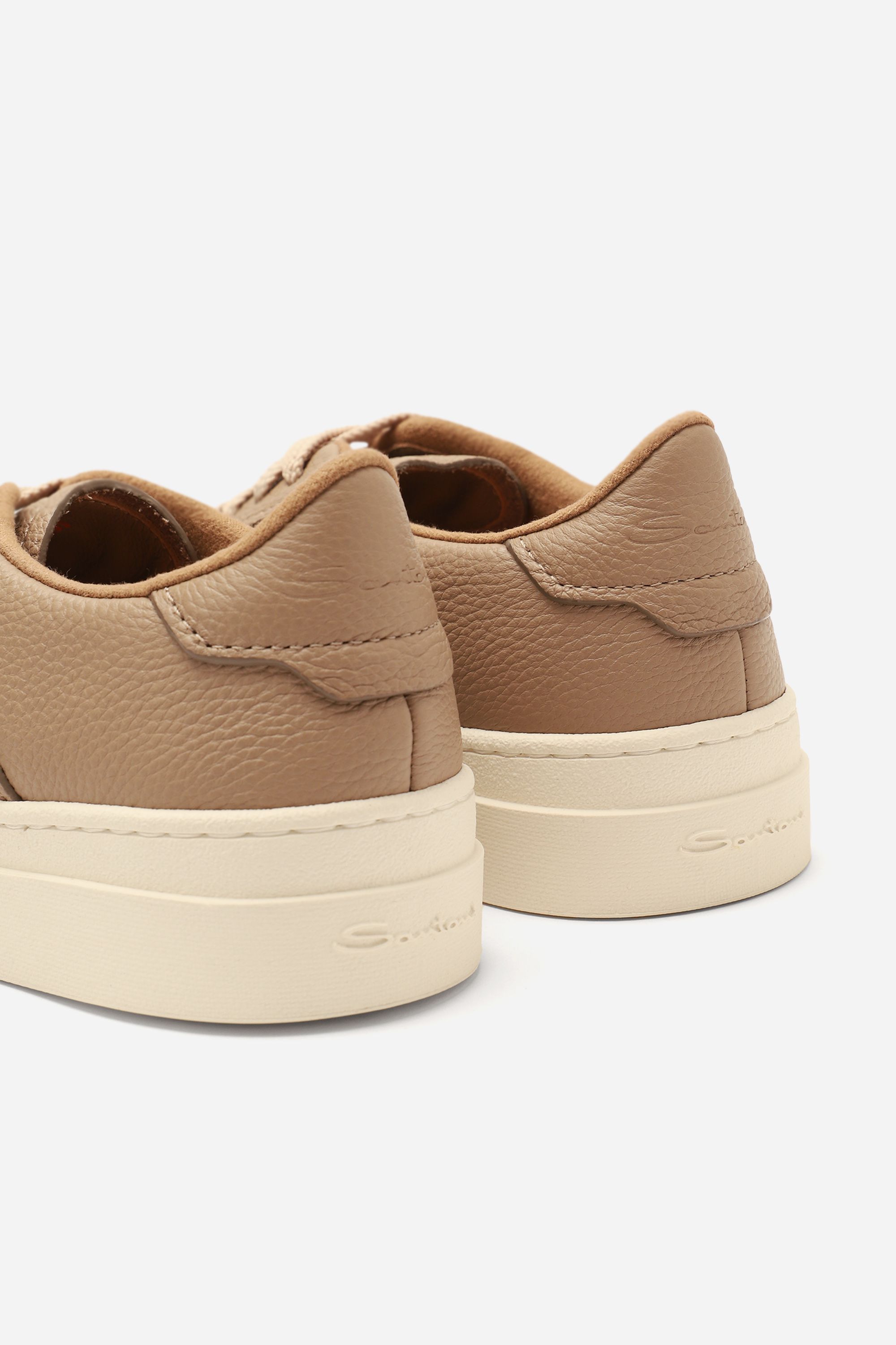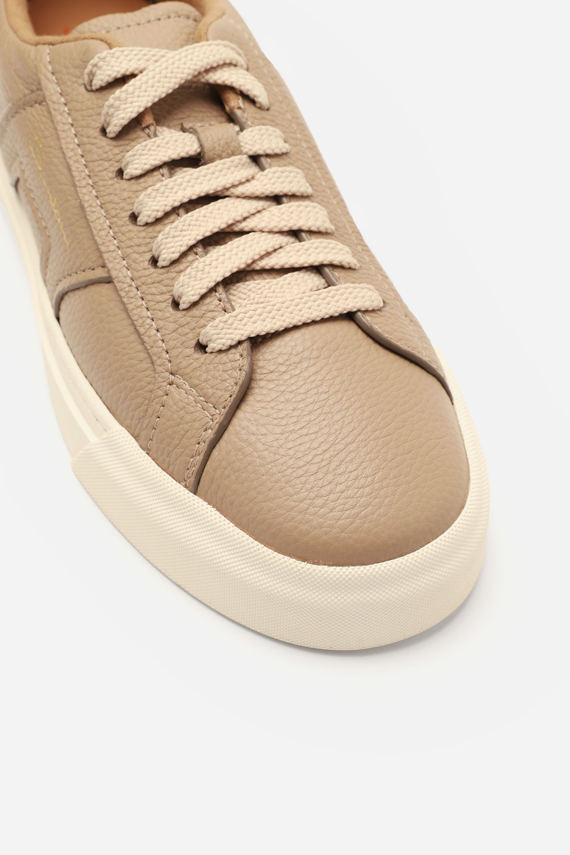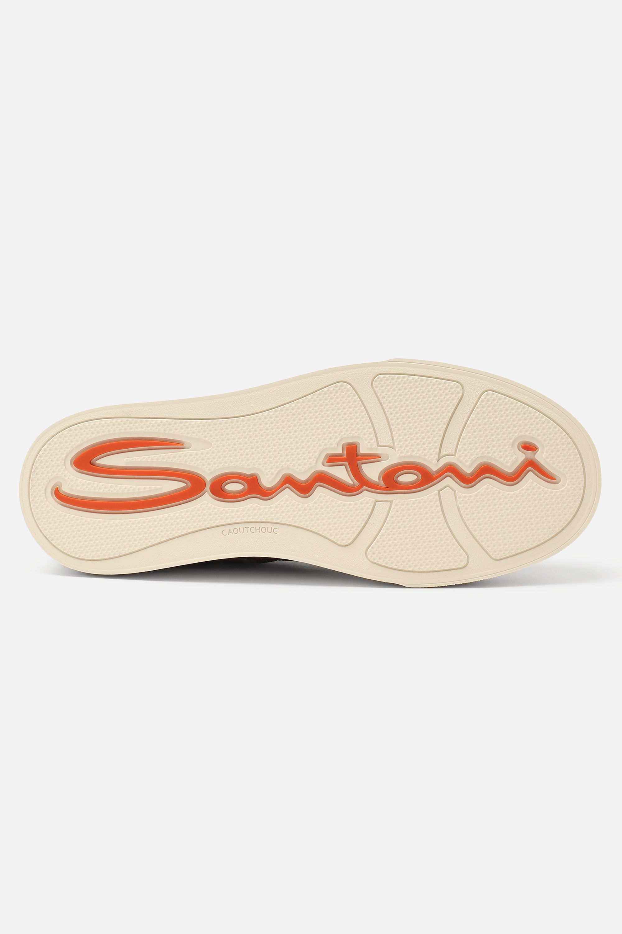 Туфли-лодочки с заостренным мысом и на каблуке средней высоты изготовили из гладкой матовой кожи. Фирменный акцент модели придает подошва знакового оранжевого отенка Arancio Santoni.