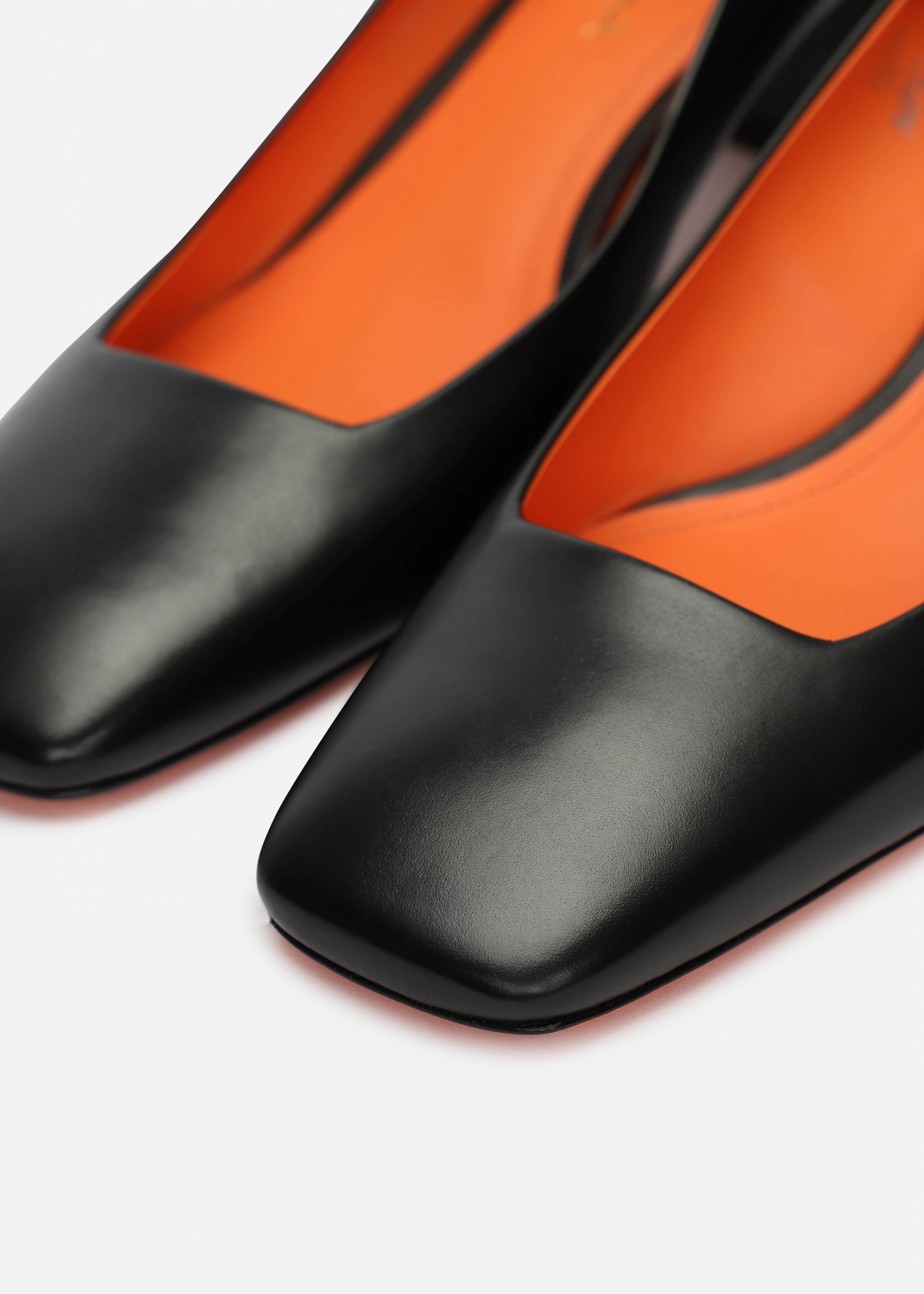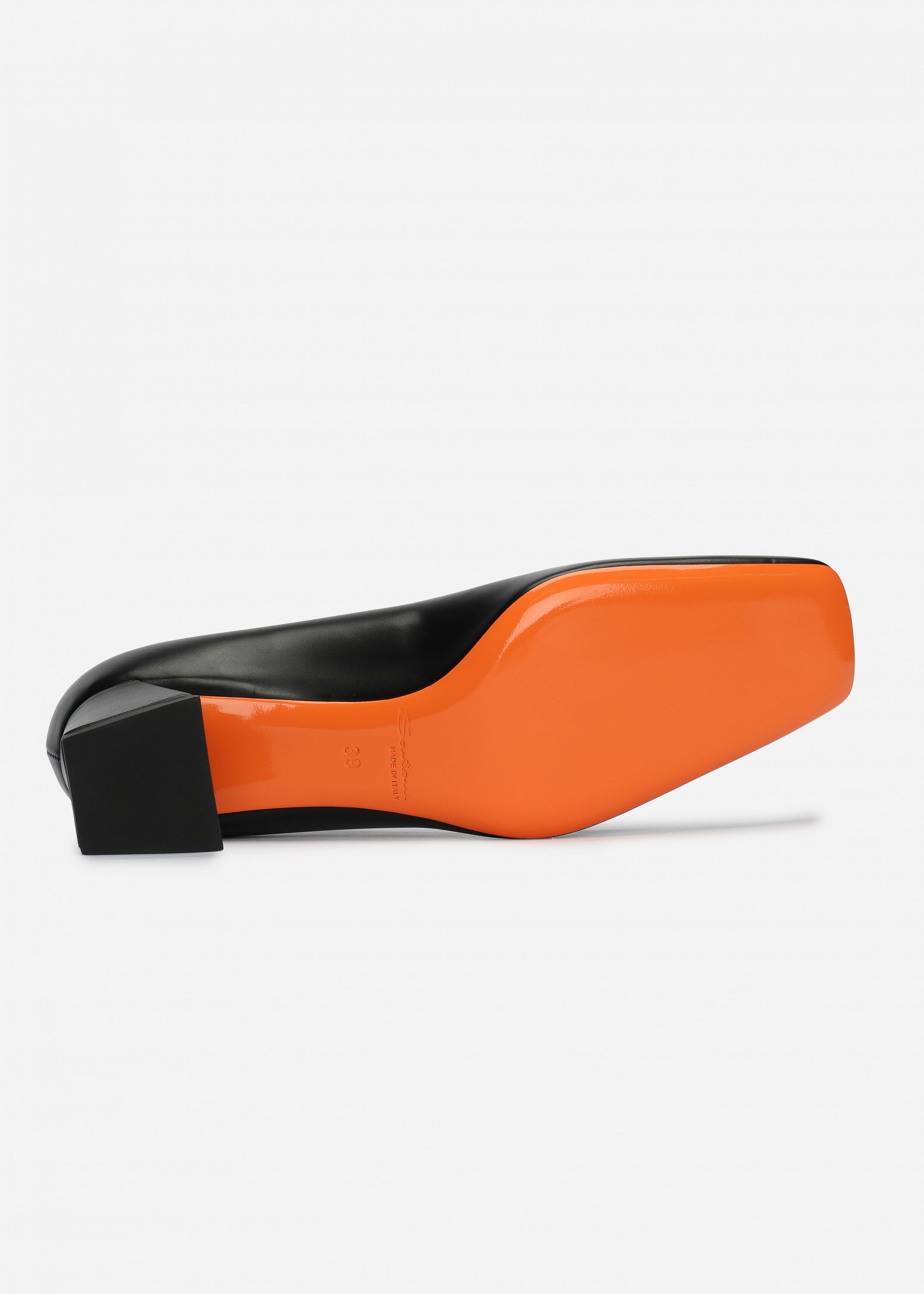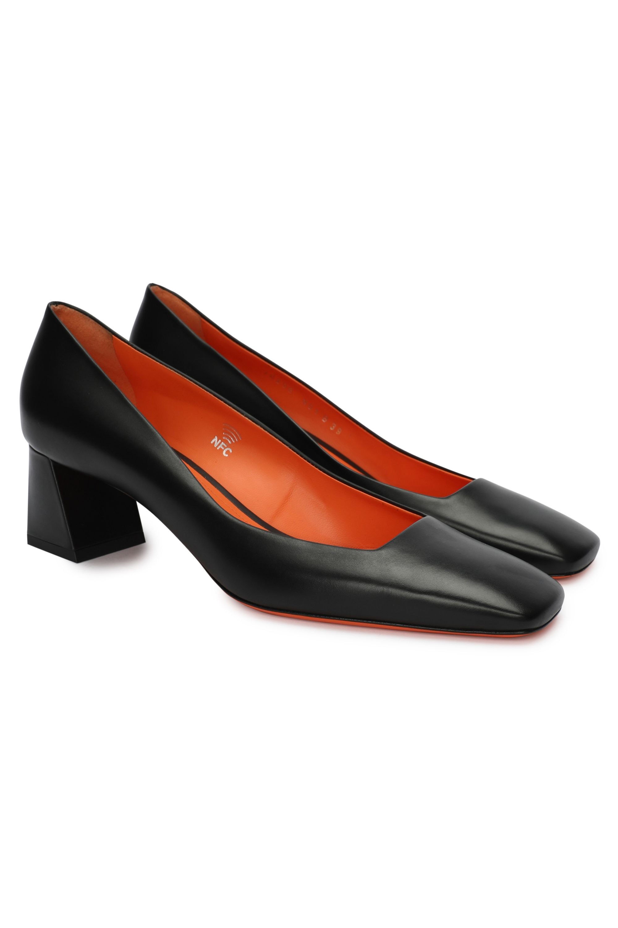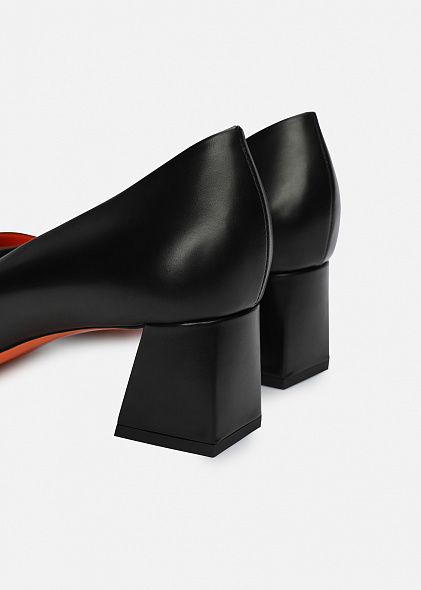 Туфли из лаковой кожи с затемненными носами и каблуками безупречно совмещают в себе женственный силуэт и фирменный стиль Santoni. Модель с открытой пяткой имеет квадратный нос, средний трапецевидный каблук и ремешок на резинке. Каждая пара обуви бренда Santoni оснащена чипом с технологией NFC, гарантирующей оригинальность продукта.
