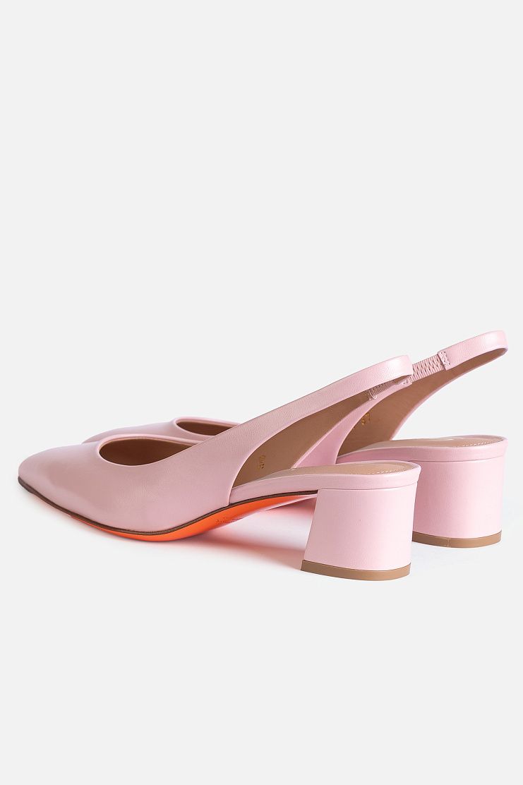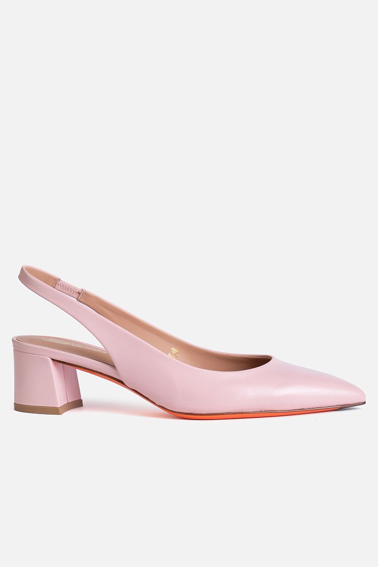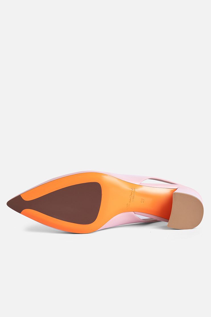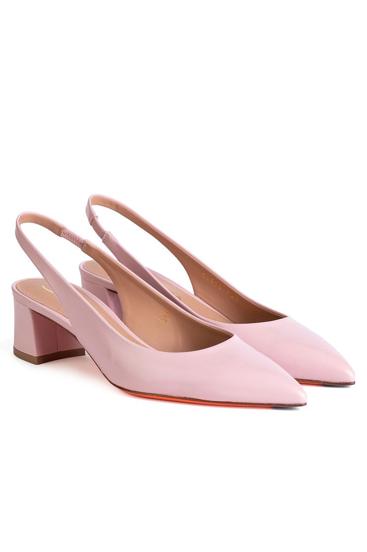 Слингбэки с заостренным мысом выполнили из гладкой кожи. Модель на небольшом фигурном каблуке фиксируется на ноге с помощью узкого ремешка. Подошва оттенка Arancio Santoni придает фирменный акцент.