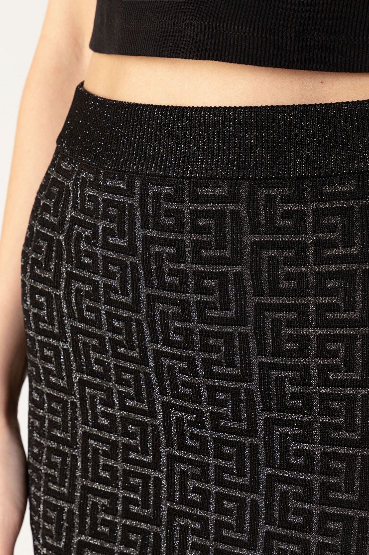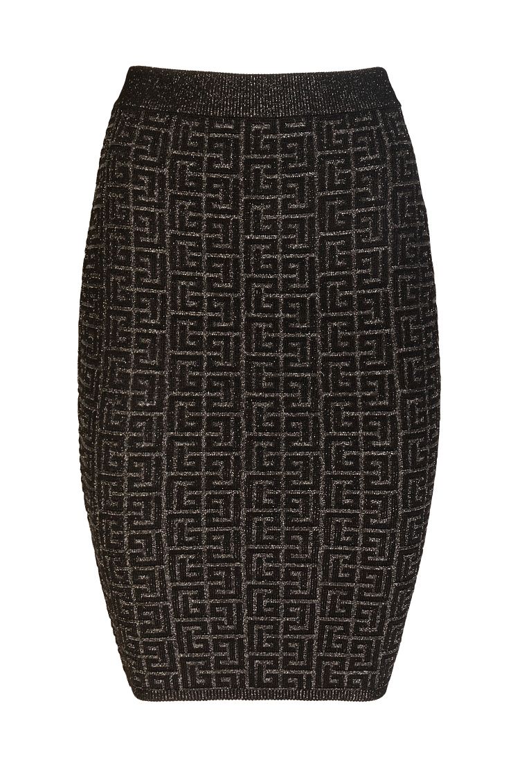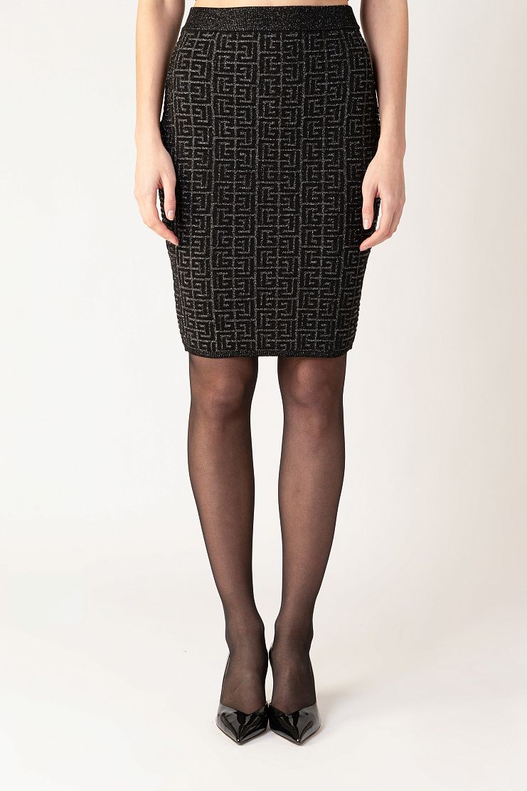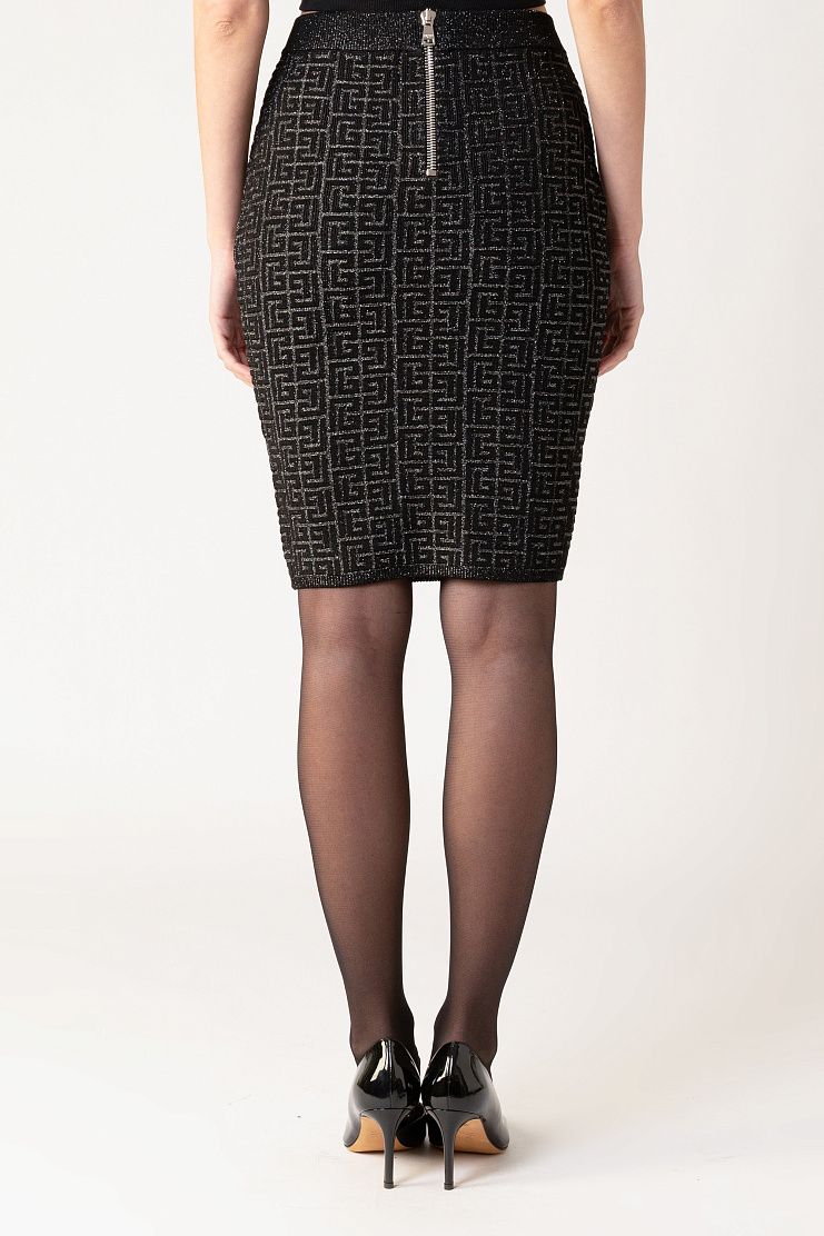 Облегающая юбка с завышенной талией выполнена из трикотажа на основе вискозы и украшена жаккардовым фирменным принтом. Модель дополнена широким эластичным поясом, ребристой отделкой и застежкой-молнией сзади. Такая юбка будет органично сочетаться с жакетом или кардиганом классического кроя.