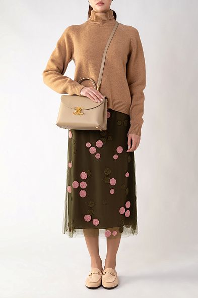 Юбку с асимметричным подолом сшили из мягкой вискозы с жаккардовым узором в горох и дополнили кружевной драпировкой. Модель с высокой посадкой и вырезом спереди застегивается на потайную молнию сбоку. Эффектный вариант для женственных образов с босоножками или мюлями.