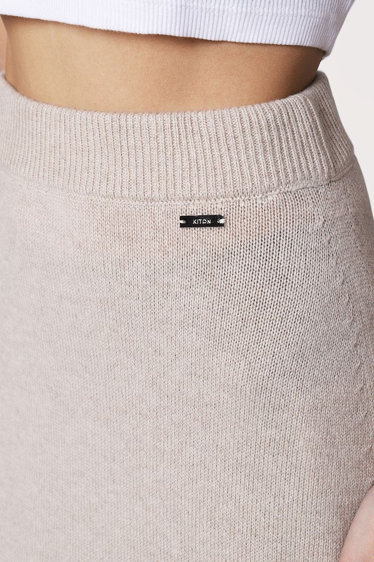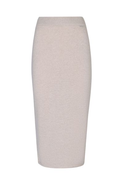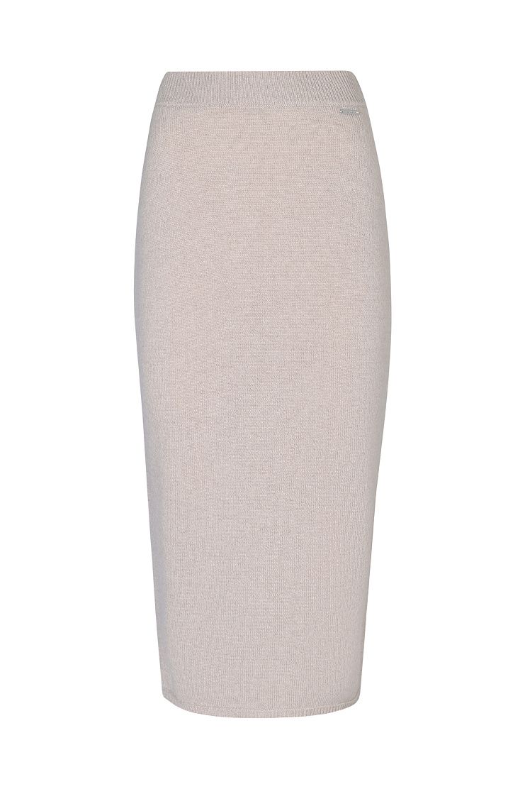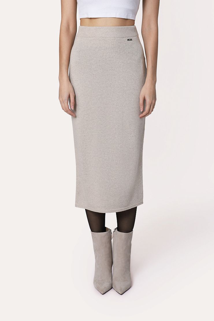 Облегающую юбку длины миди связали из тонкой кашемировой пряжи. Модель с высокой посадкой дополнена эластичной резинкой на поясе и небольшим металлическим логотипом спереди.