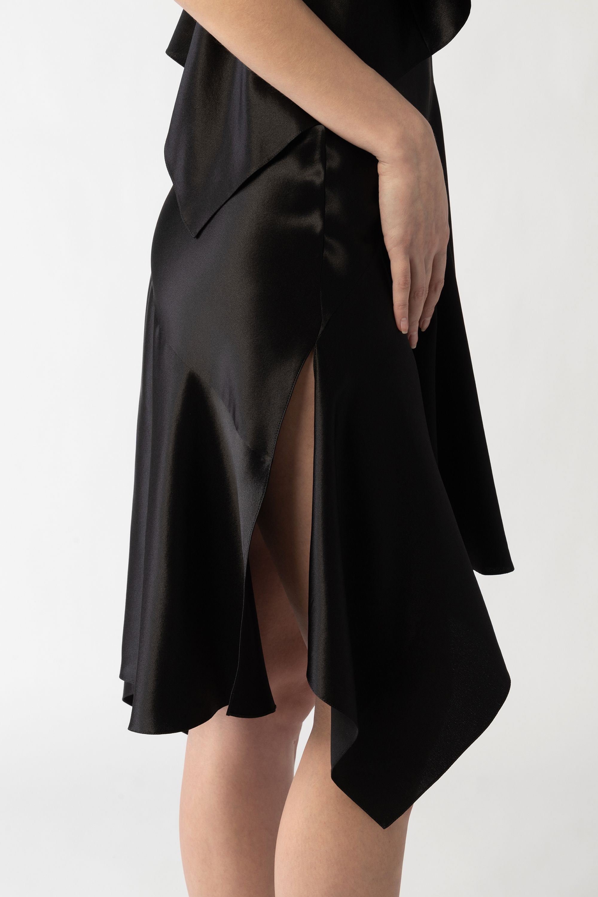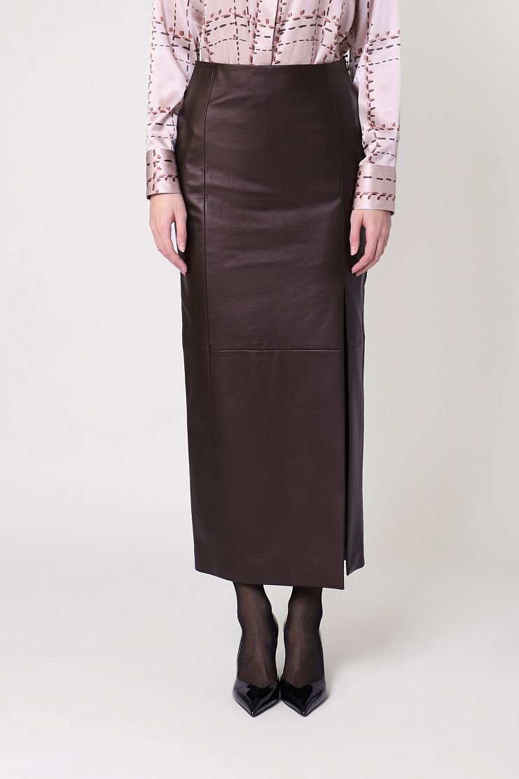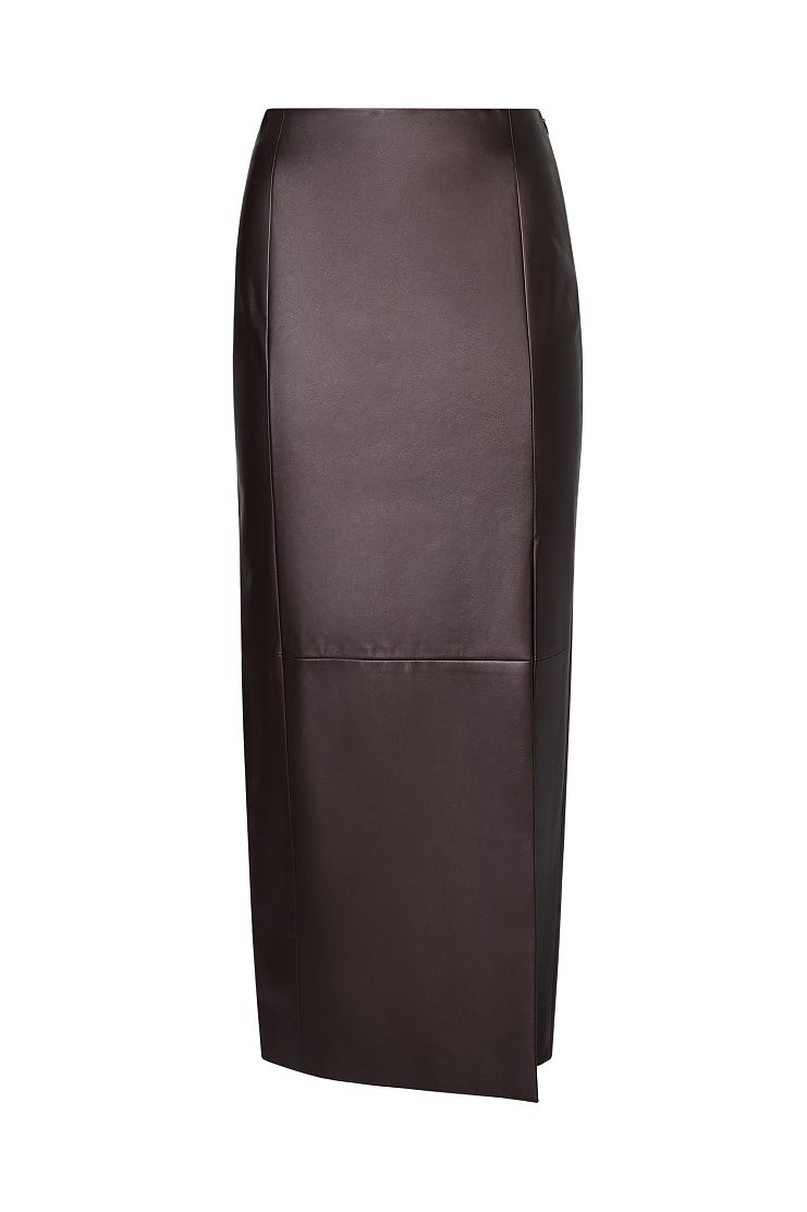 Юбку-миди прямого кроя сшили из мягкой и прочной искусственной кожи с матовым блеском. Модель со шлицей сбоку дополнена гладким подкладом и застегивается на молнию сбоку.
