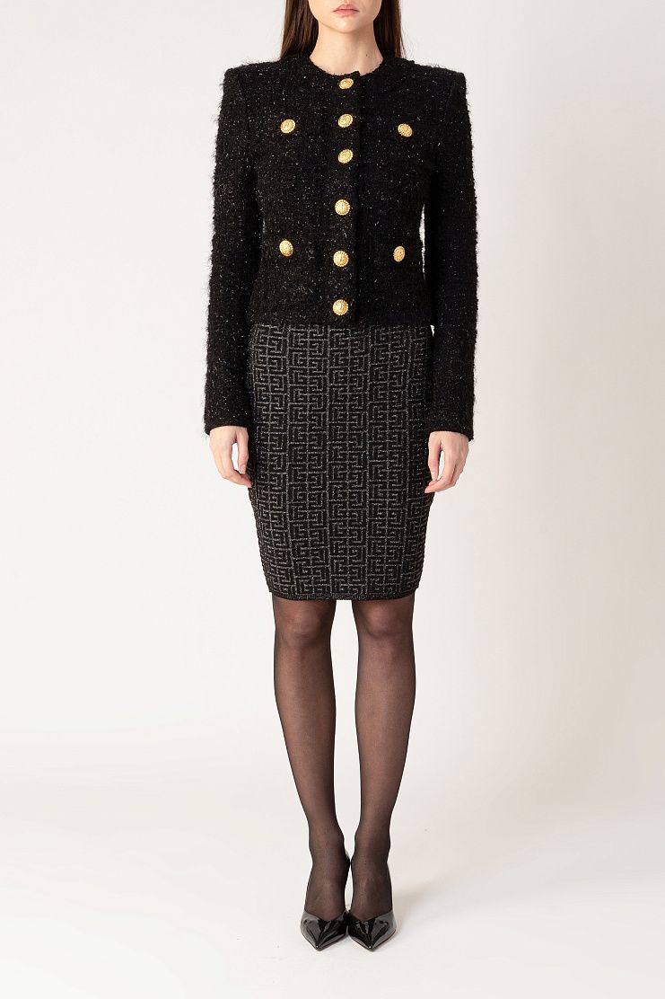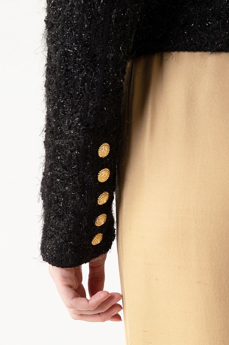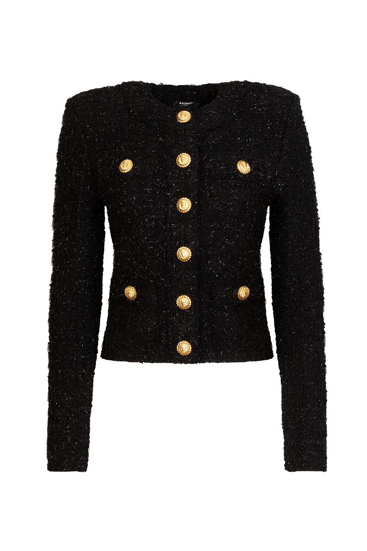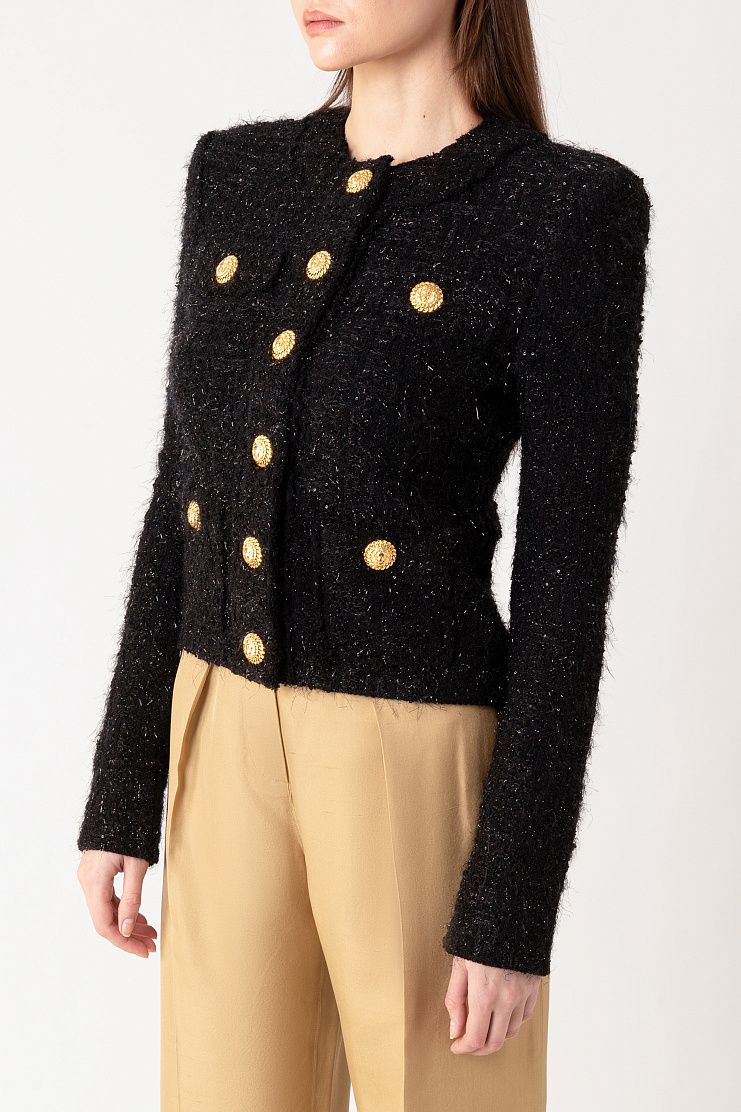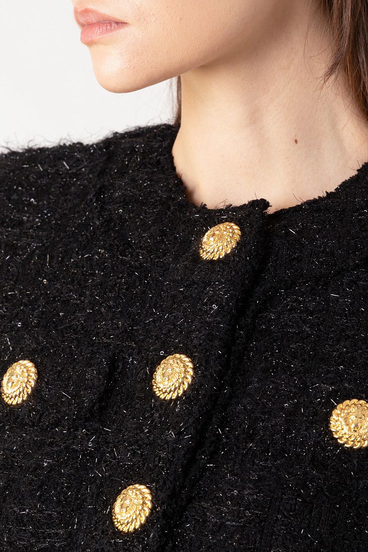 Укороченный однобортный жакет выполнен из фактурной твидовой ткани с мерцающей нитью. Модель дополнена круглым вырезом, накладными карманами, подплечниками и длинными рукавами с манжетами. Фигурные золотистые пуговицы подчеркивают классический стиль. Такой жакет составит гармоничный дуэт со строгими брюками или мини-юбкой.