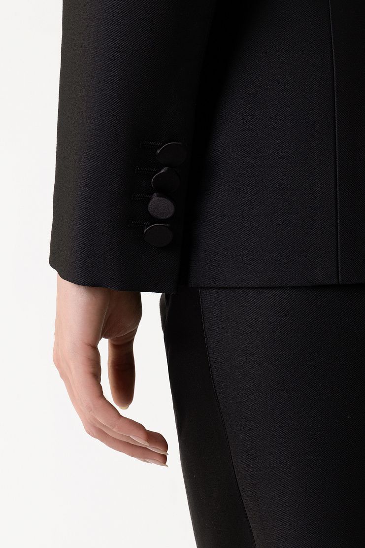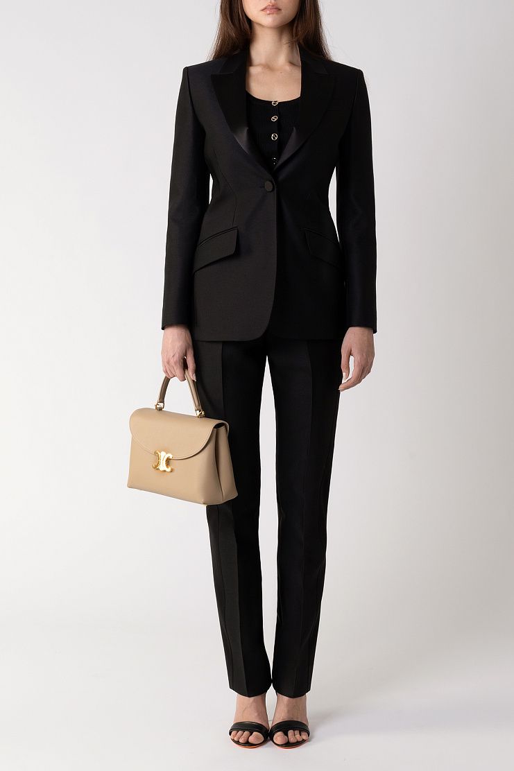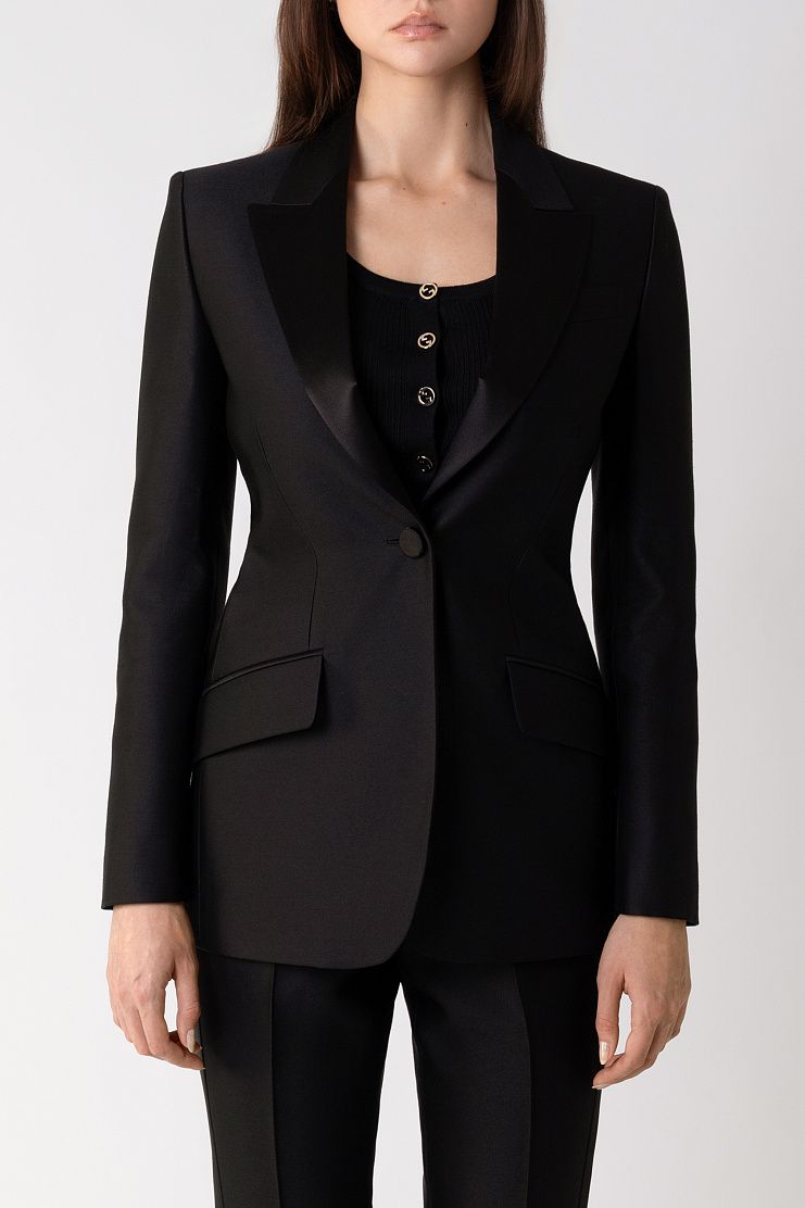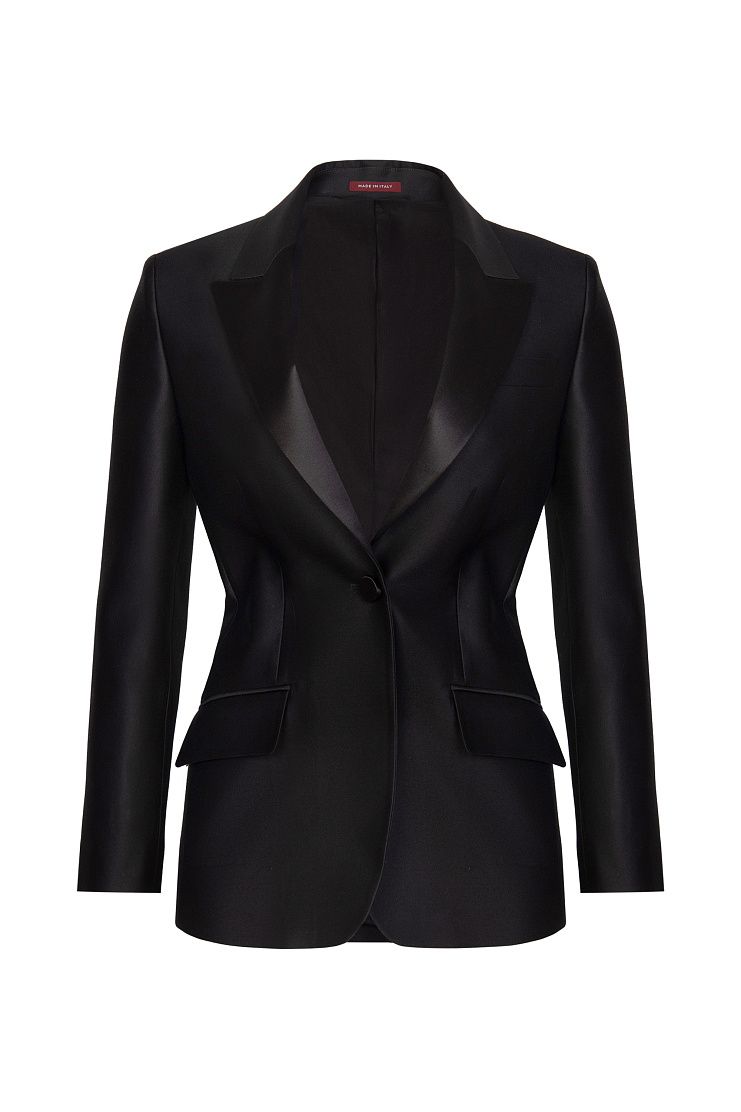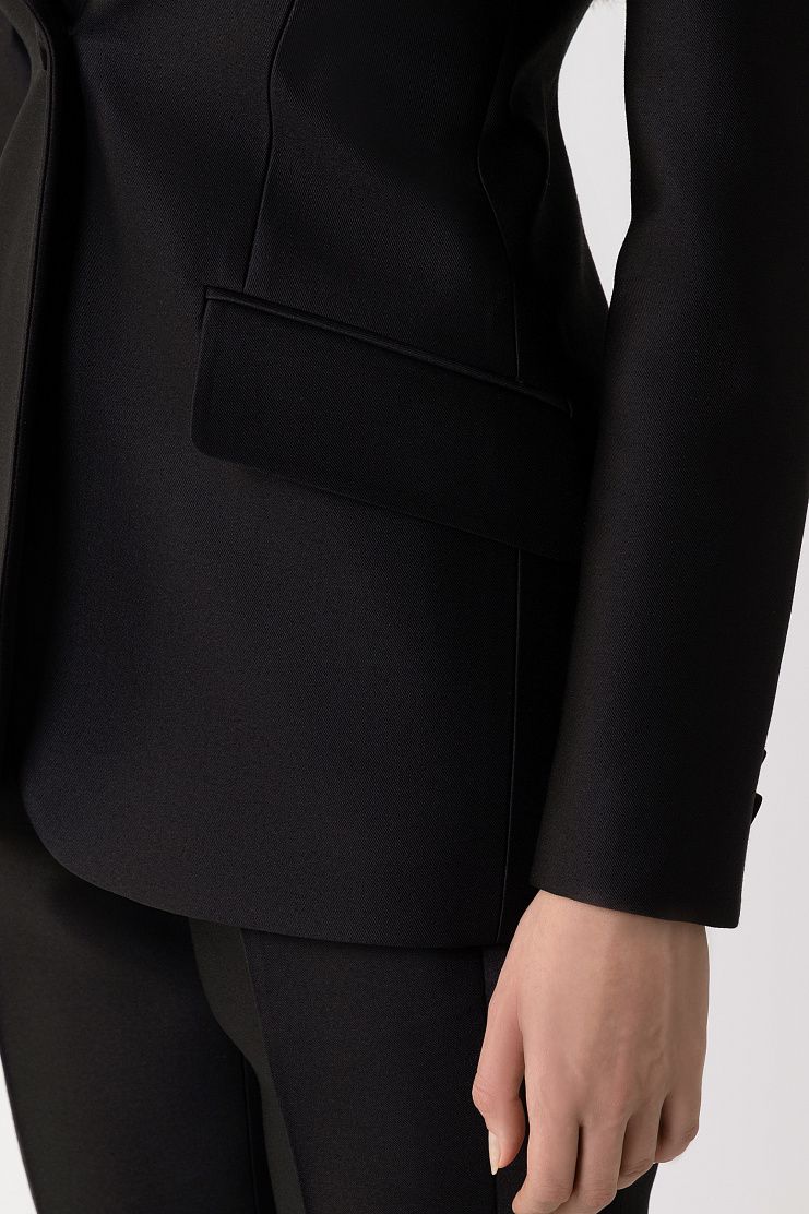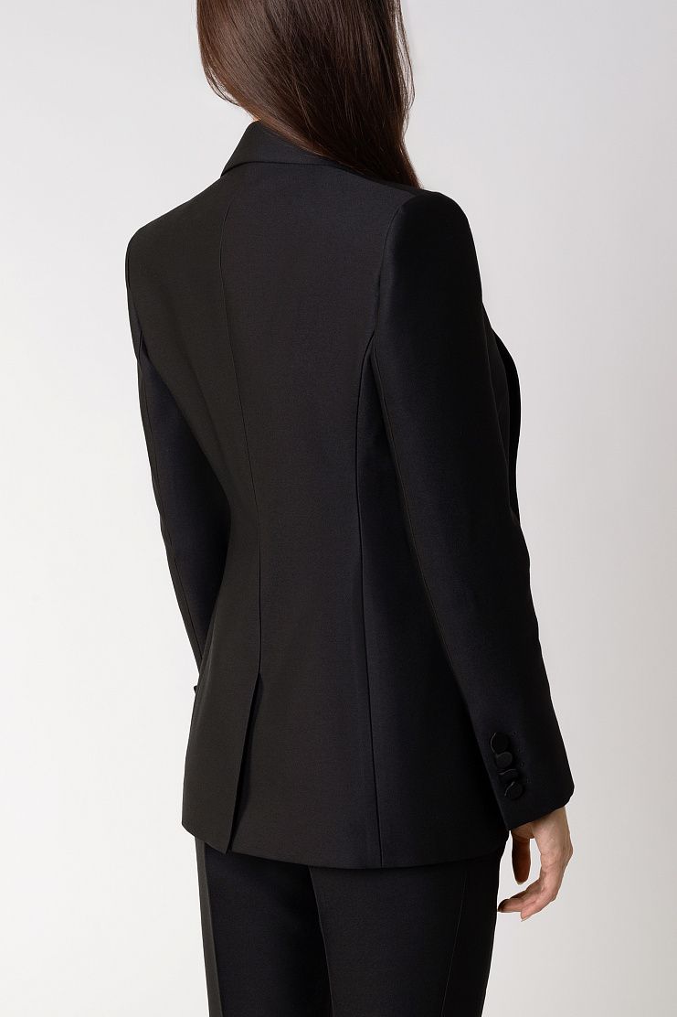 Приталенный жакет с акцентированной линией плеч выполнен из мягкой и тонкой шерсти. Однобортная модель с заостренными шелковыми лацканами, карманами с клапанами и шлицей сзади застегивается на обтянутую тканью пуговицу. Классический жакет органично дополнит и деловой, и вечерний образ.