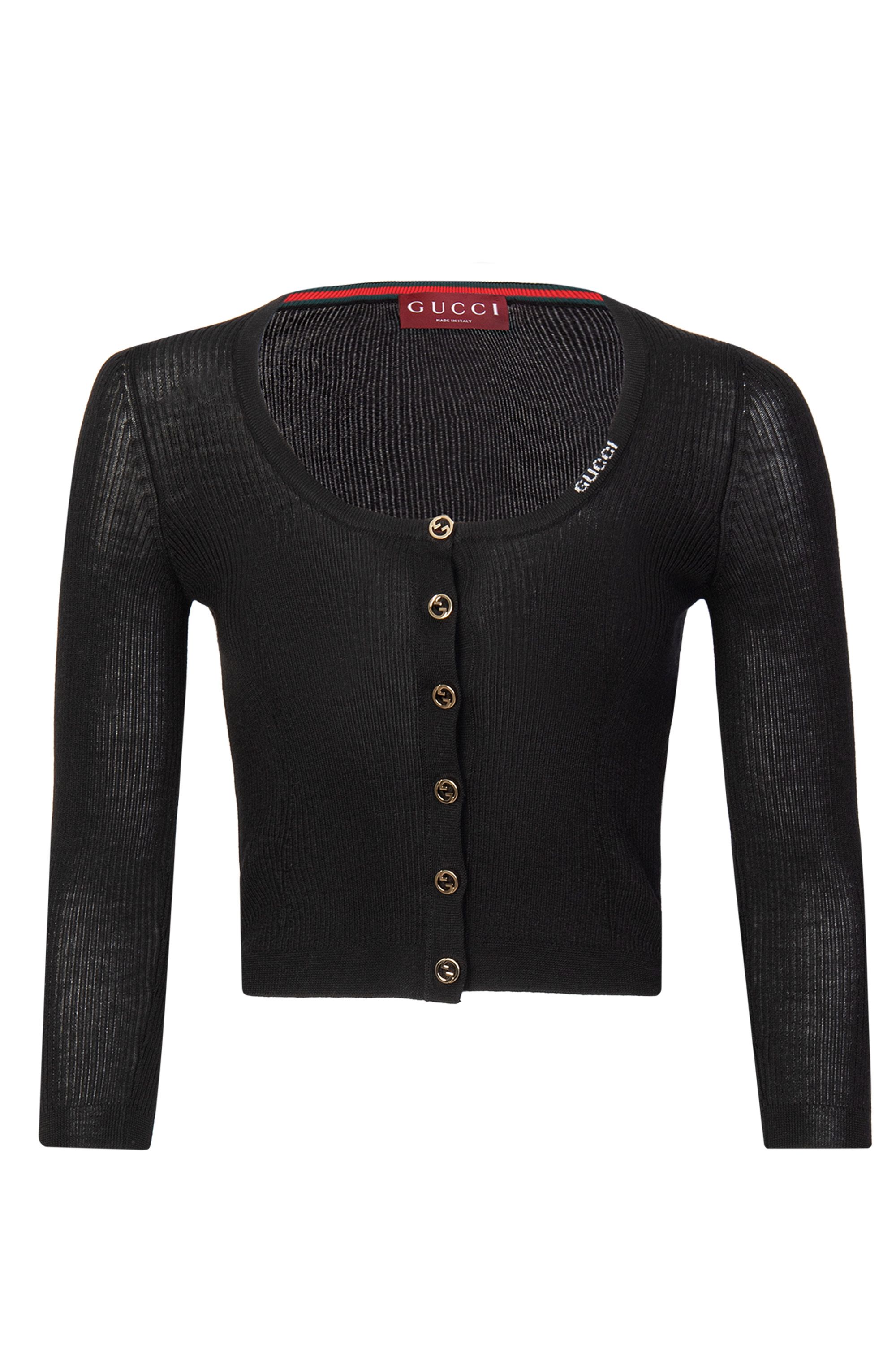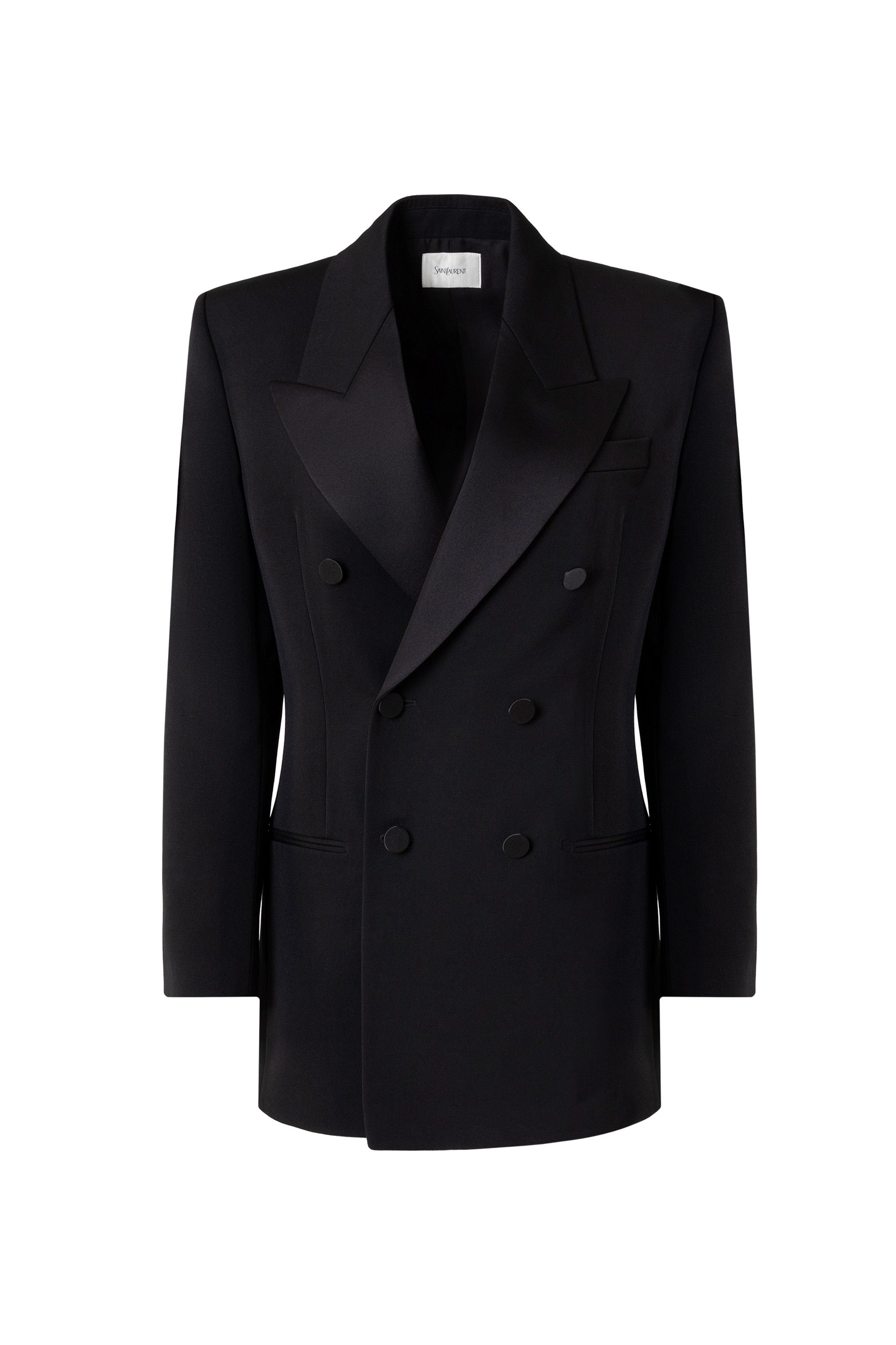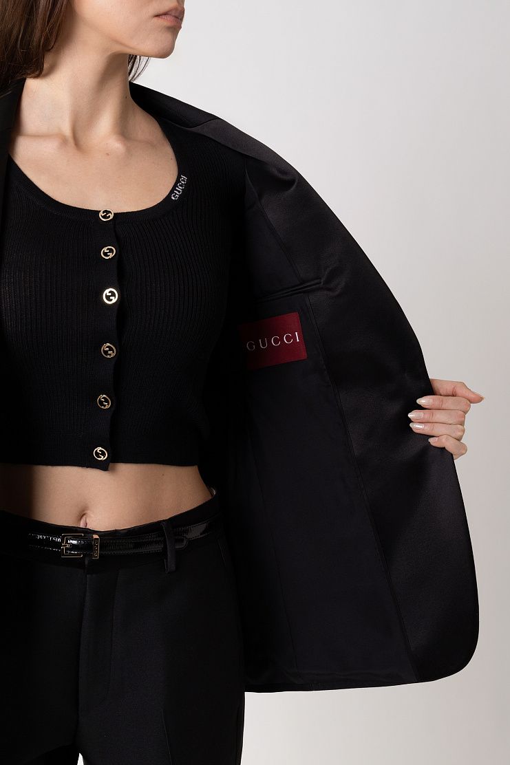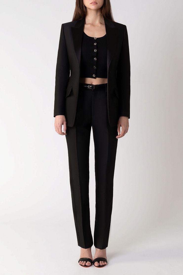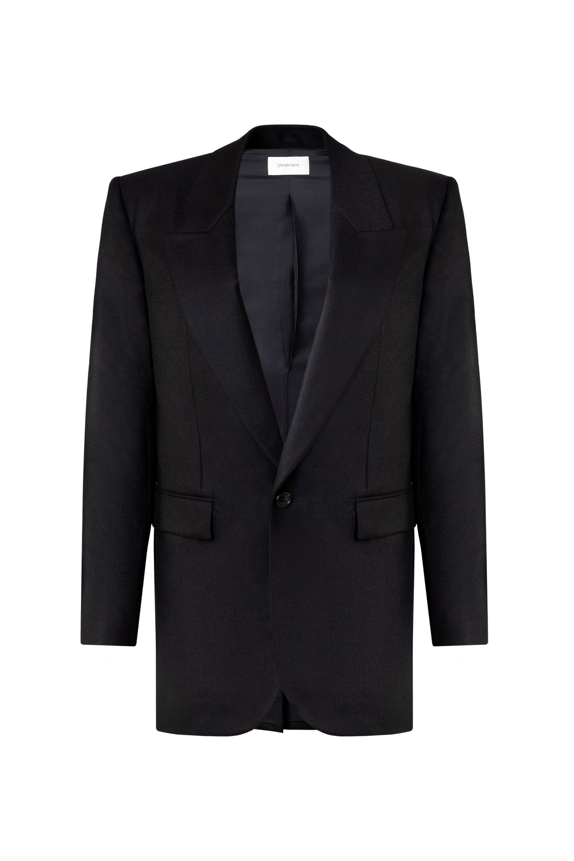 Приталенный жакет с акцентированной линией плеч выполнен из мягкой и тонкой шерсти. Однобортная модель с заостренными шелковыми лацканами, карманами с клапанами и шлицей сзади застегивается на обтянутую тканью пуговицу. Классический жакет органично дополнит и деловой, и вечерний образ.