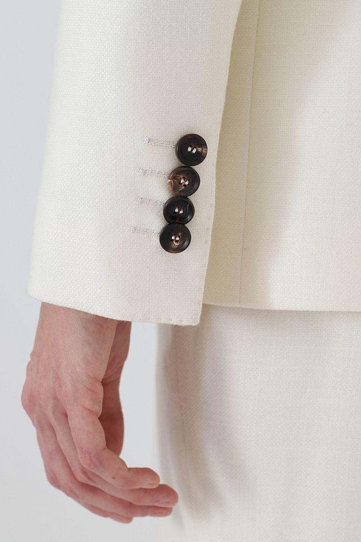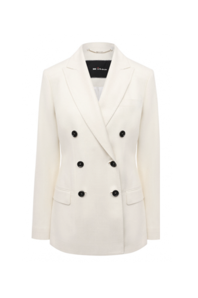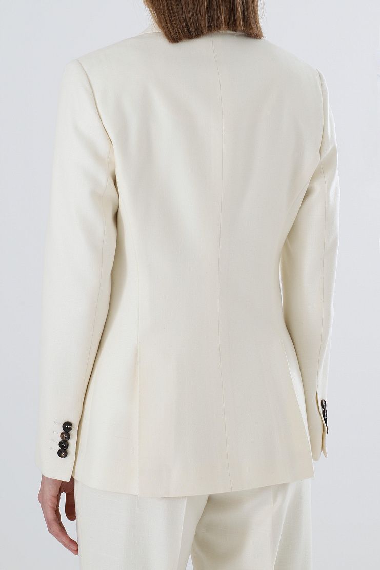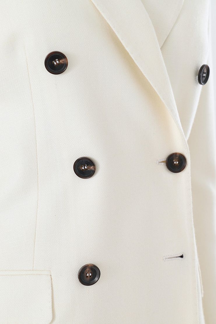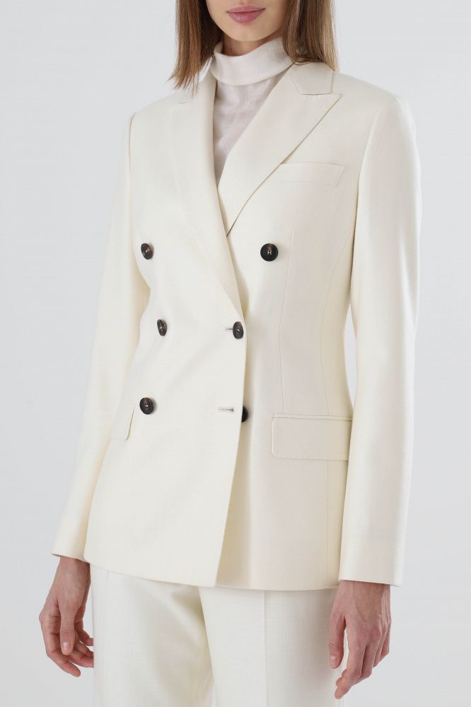Двубортный жакет из кашемира и шелка в сочетании с брюками того же оттенка составит элегантный костюм для неформального или торжественного мероприятия. Удлиненная модель приталенного силуэта с заостренными лацканами и боковыми карманами.