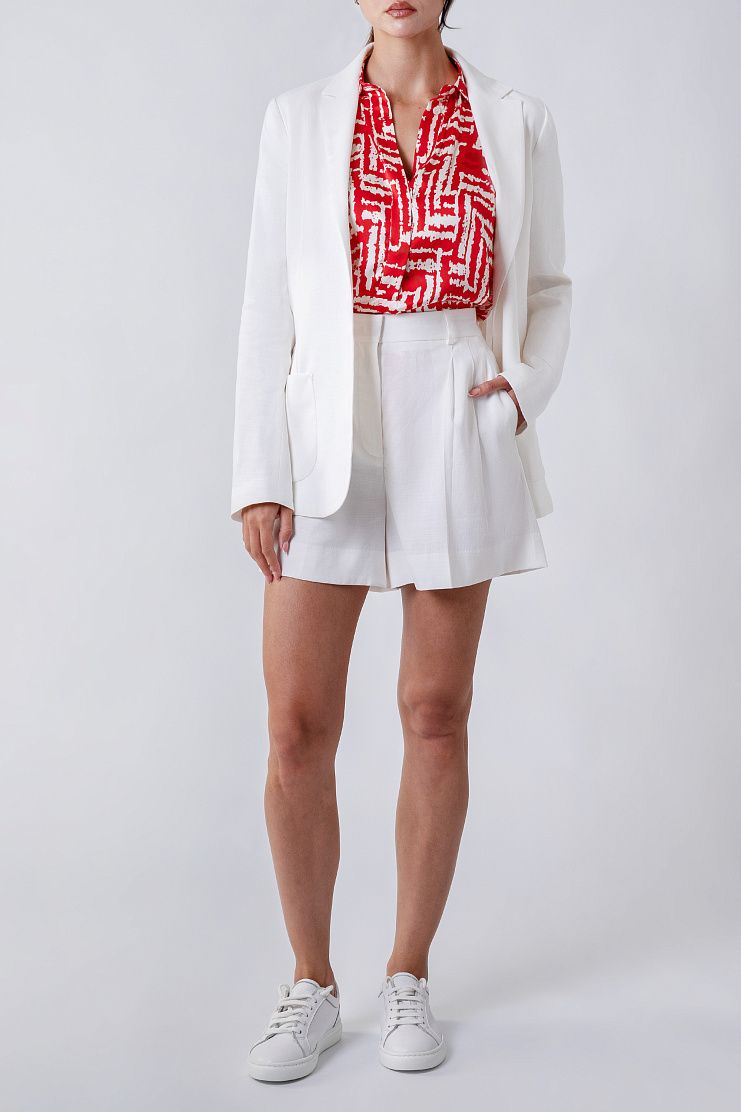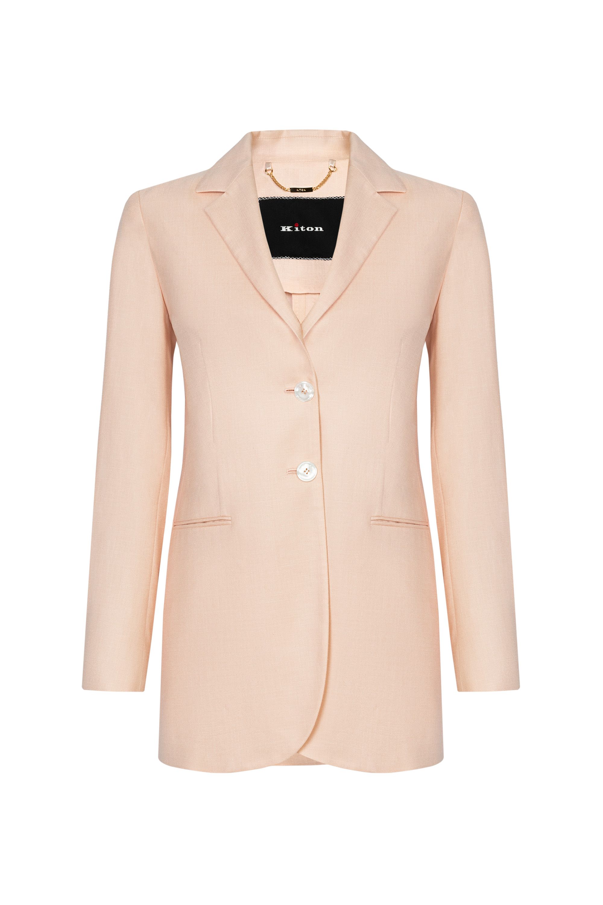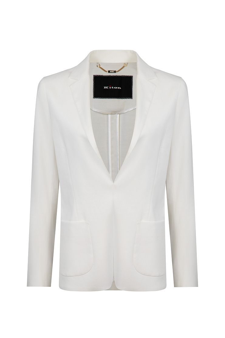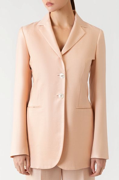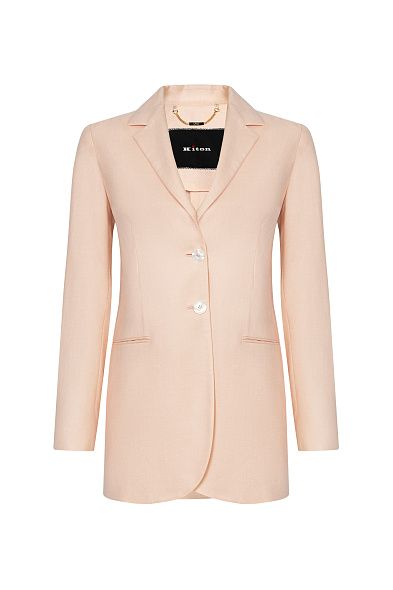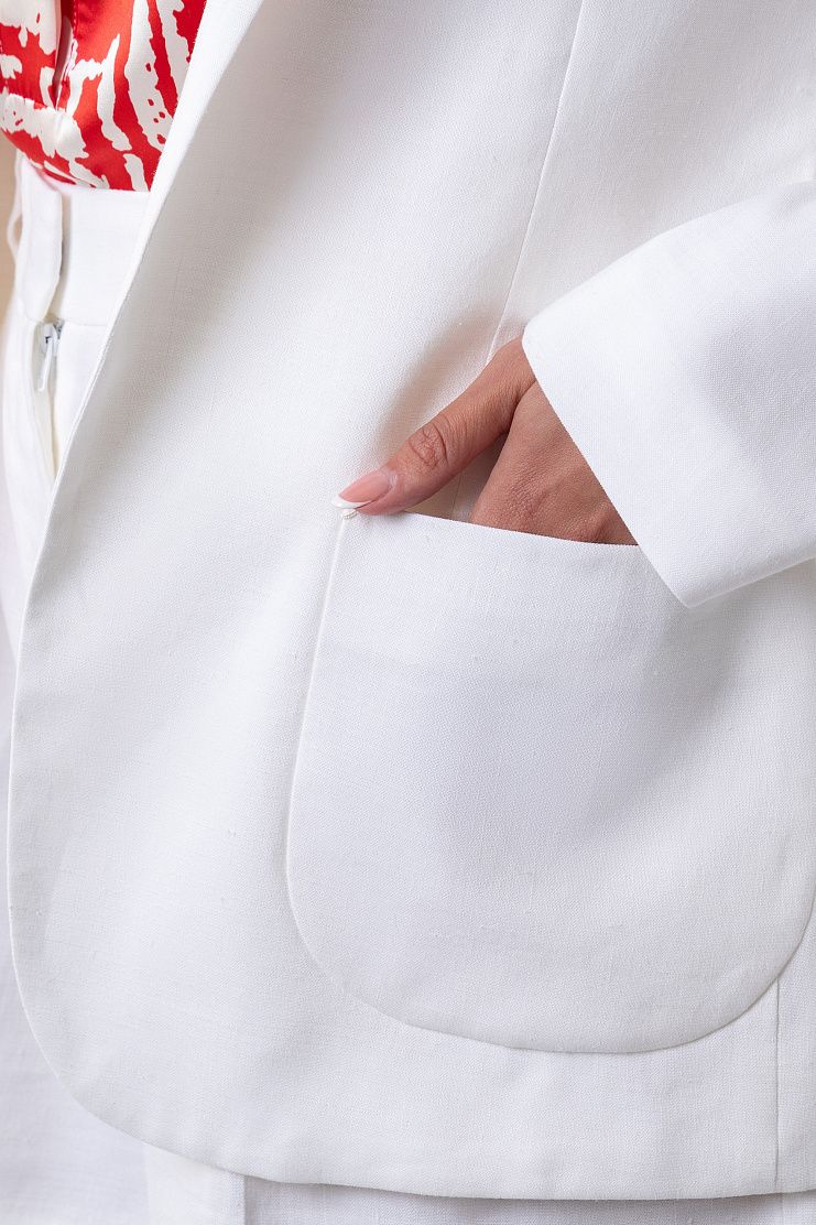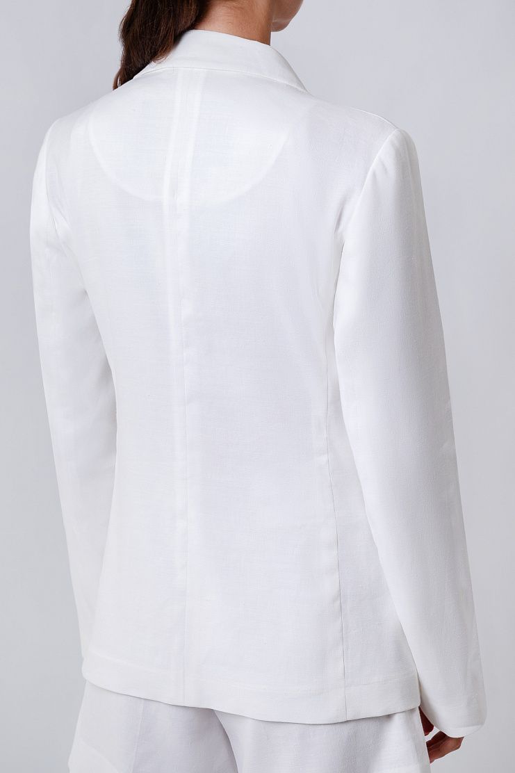 Однобортный приталенный жакет из легкой и дышащей ткани на основе льна и вискозы легко впишется в летний гардероб. Модель с прямоугольными лацканами дополнена накладными карманами. Изделие без подклада идеально садится по фигуре.