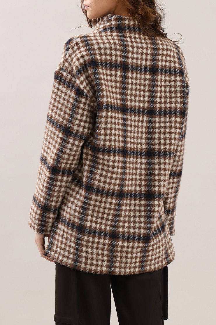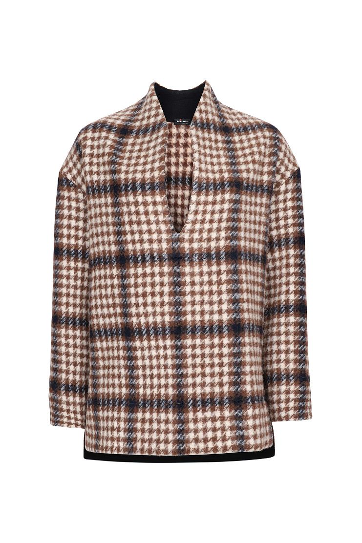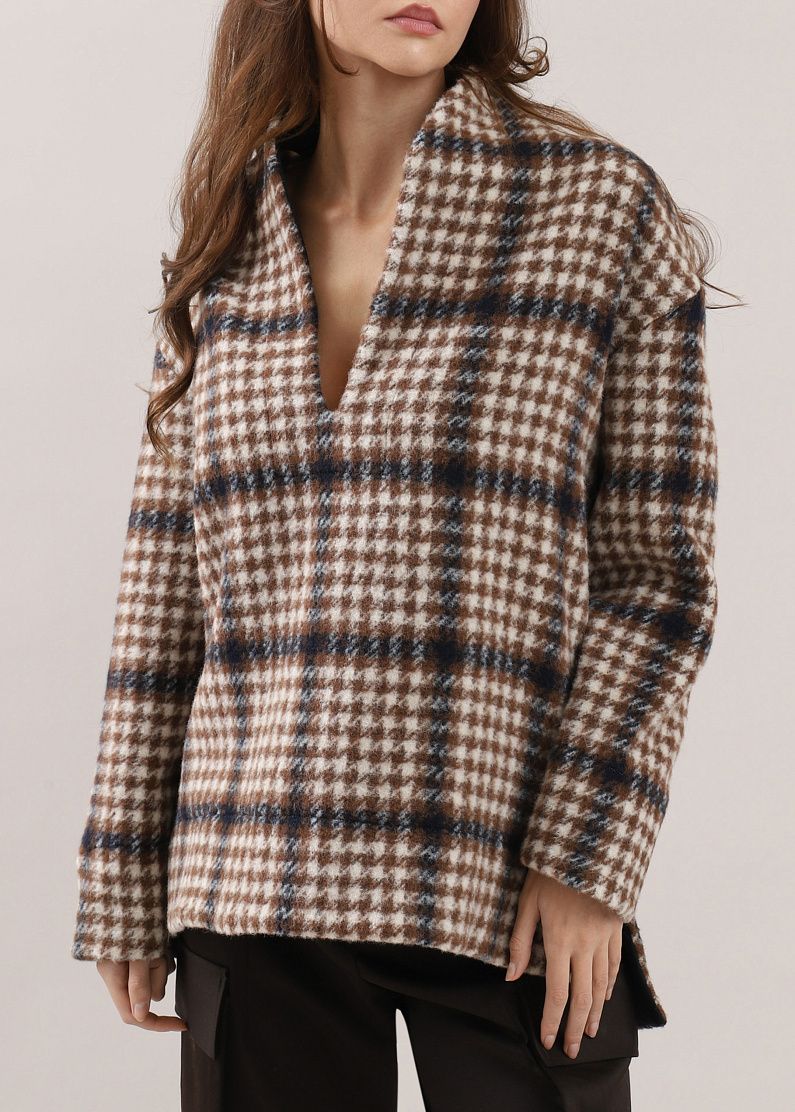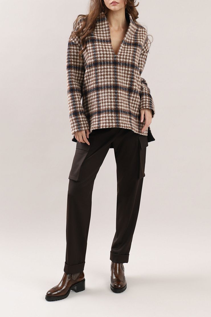 Жакет в клетку из шерсти и мягкой шерсти альпака позволит создать стильный повседневнй образ. Модель свободного кроя имеет V-образный вырез, рукава со спущенным плечом и ассиметричный нижний край.