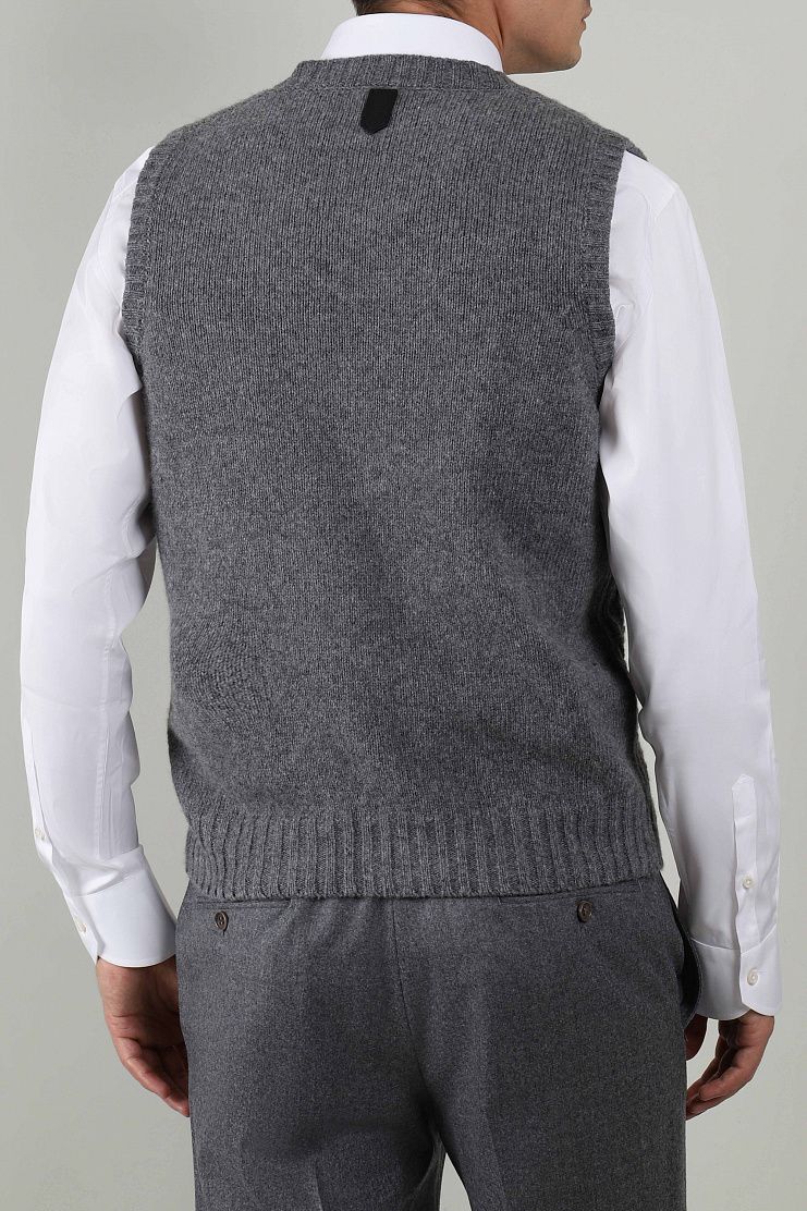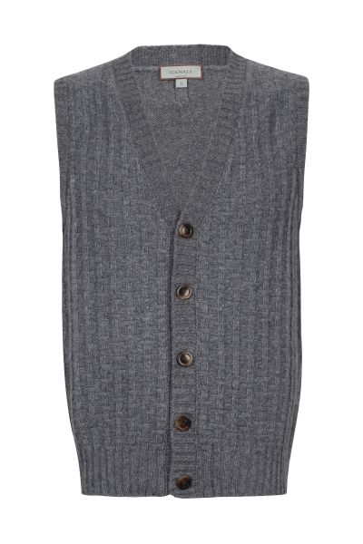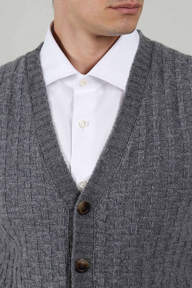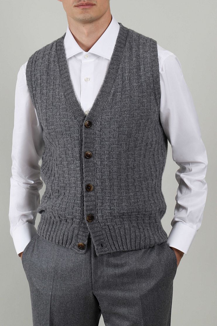 Жилет фактурной вязки прекрасно подойдет как для повседневного, так и для неформального элегантного стиля. Модель свободного кроя с V-образным вырезом и застежкой на пуговицы.