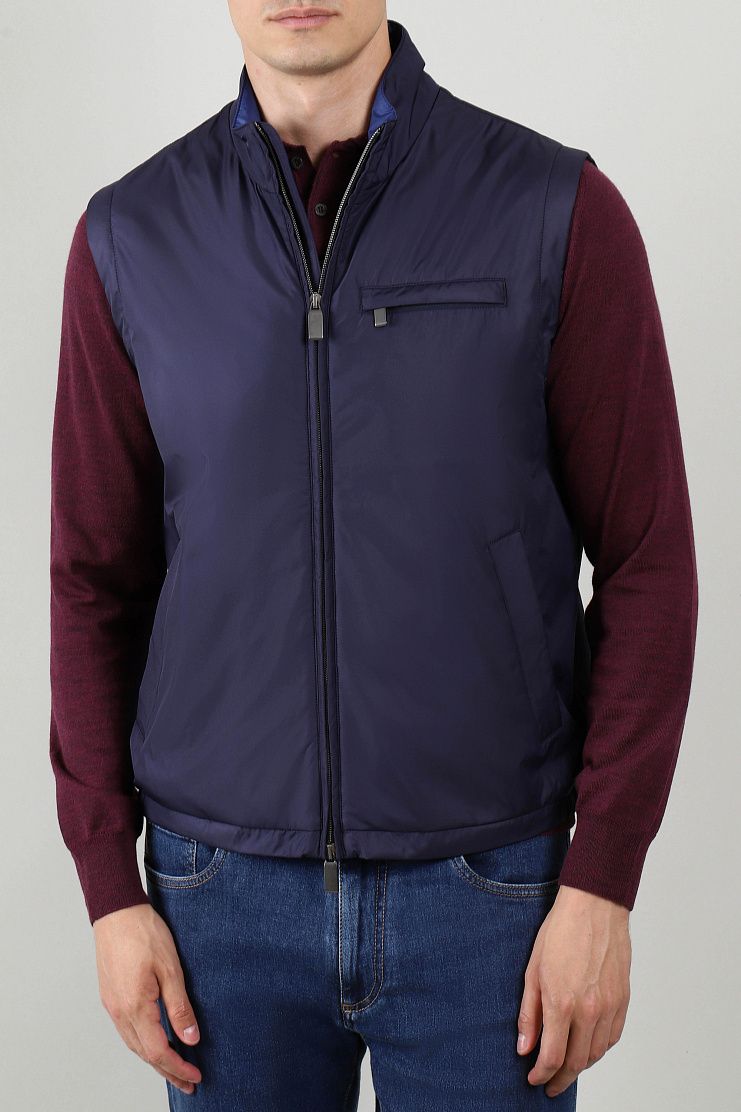 Жилет превосходно подойдет для повседневного образа в городском или уличном стиле. Модель свободного кроя с воротником-стойкой, нагрудным и боковыми карманами и застежкой на молнию. Благодаря ткани со специальной пропиткой изделие обладает водоотталкивающими свойствами.