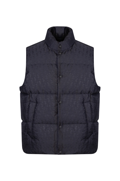 Стеганый жилет, украшенный жаккардовым паттерном Dior Oblique по всей поверхности, сшили из прочного нейлона. Модель дополнена тремя карманами и украшена резиновой нашивкой Dior сзади.