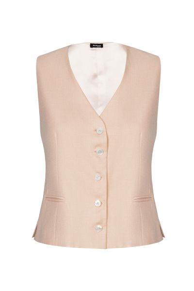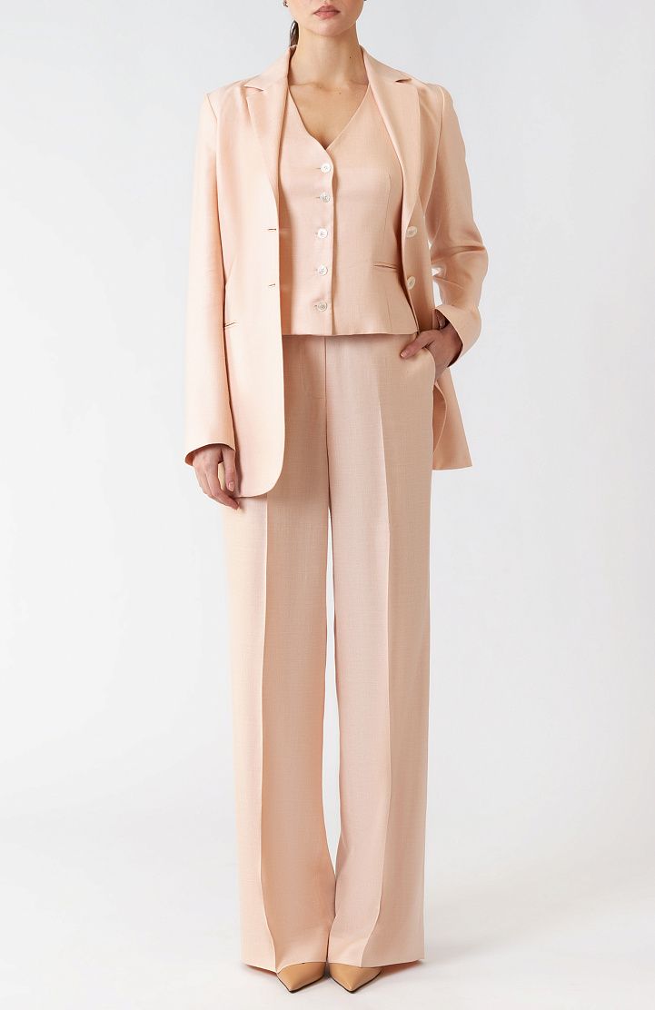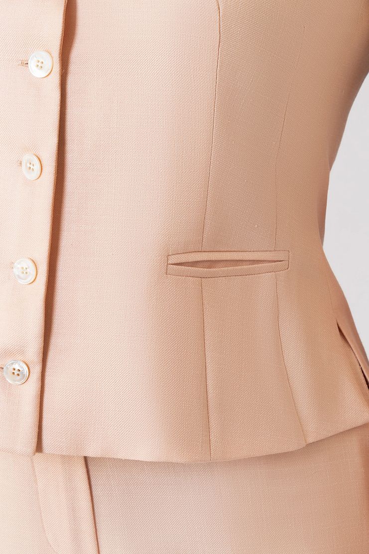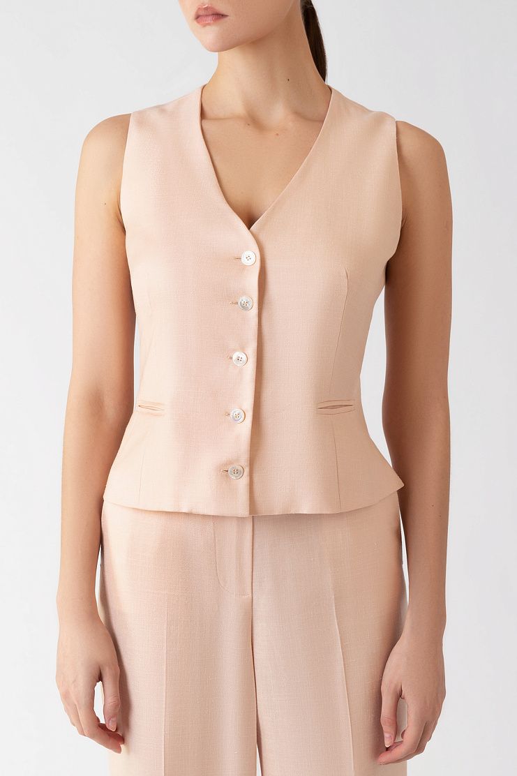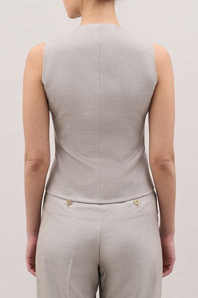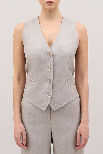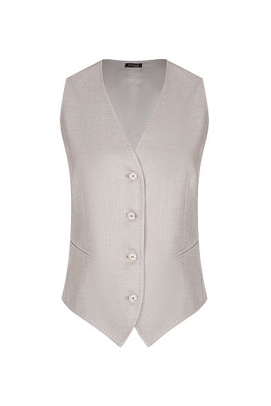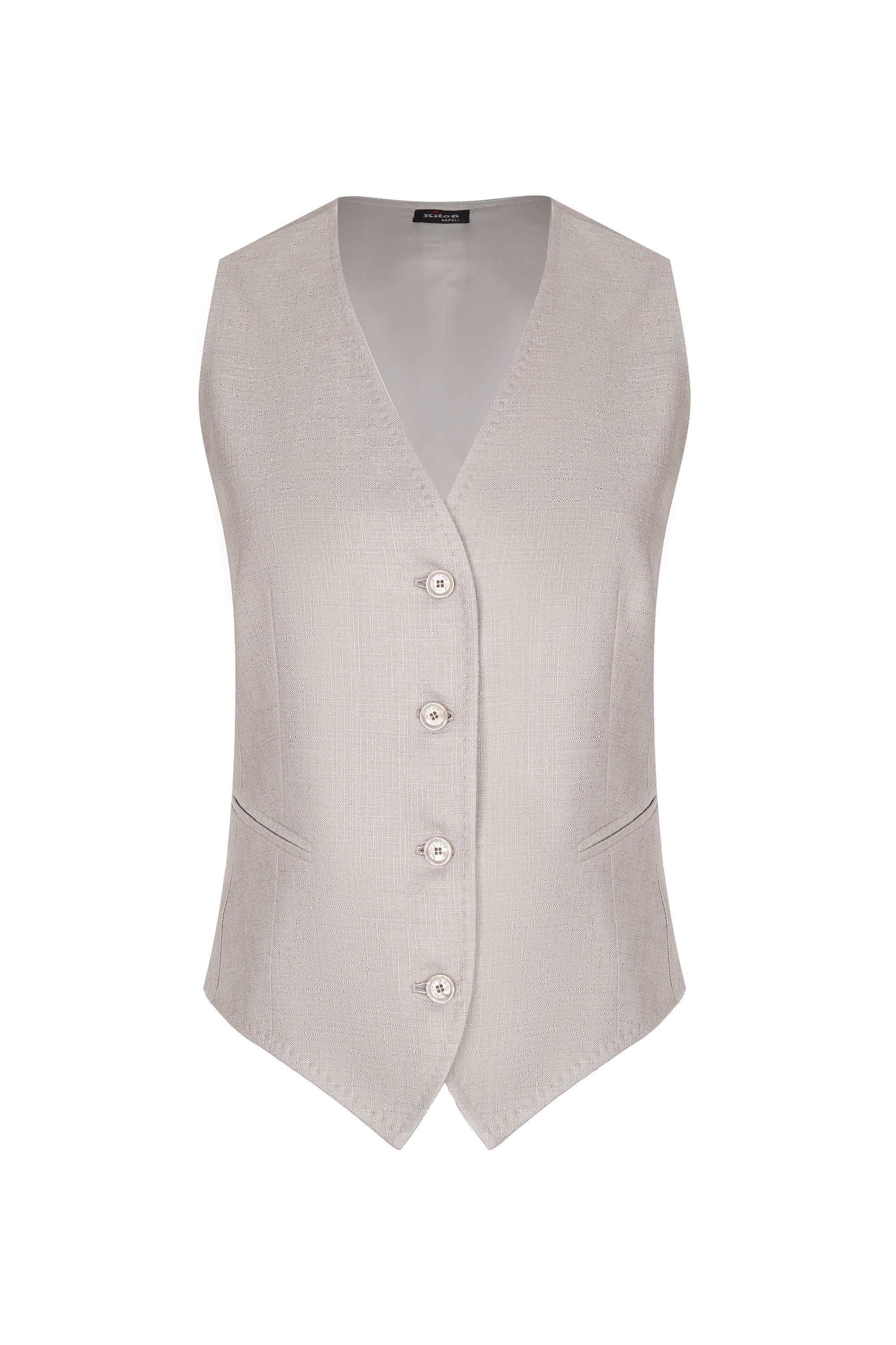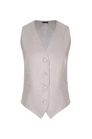 Приталенный однобортный жилет с карманами сшили из смеси шерсти, шелка и льна. Изделие с небольшими разрезами по бокам застегивается на перламутровые пуговицы. Модель идеально сочетается с комплектными брюками и пиджаком.