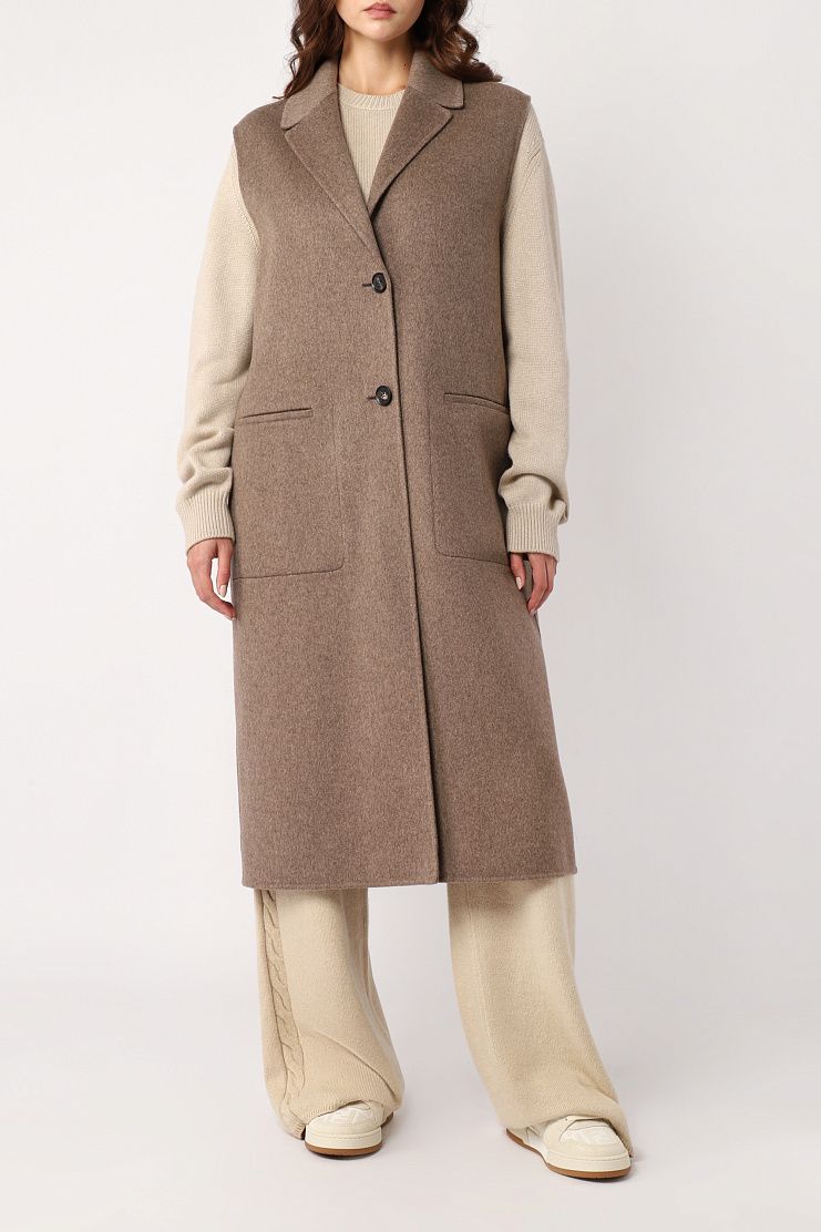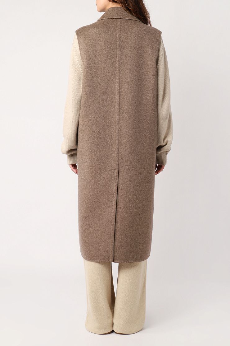 Удлиненный жилет прямого кроя выполнен из мягкого кашемира, обработанного по технологии Rain System®, защищающей в непогоду. Жилет дополнен классическим воротником с лацканами, карманами спереди и шлицей на задней части. Застегивается на роговые пуговицы.
