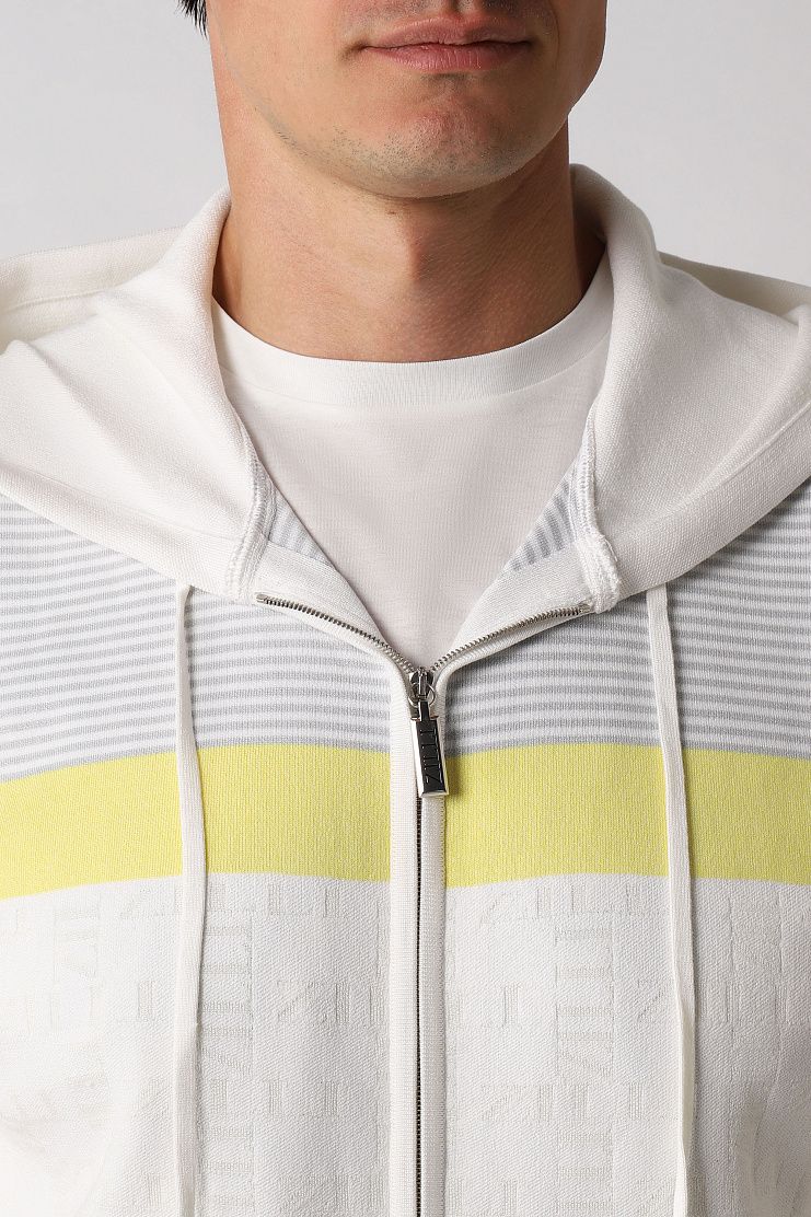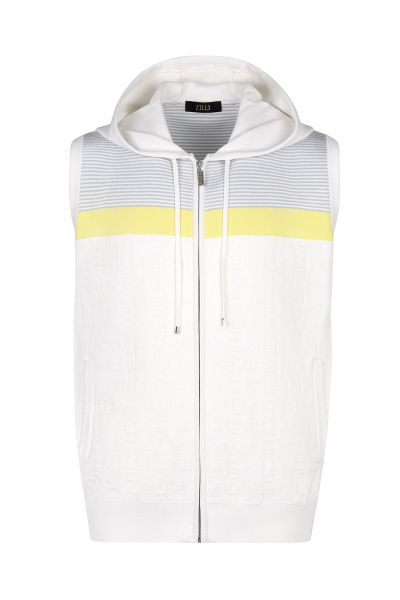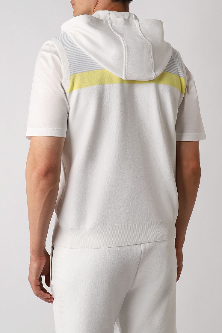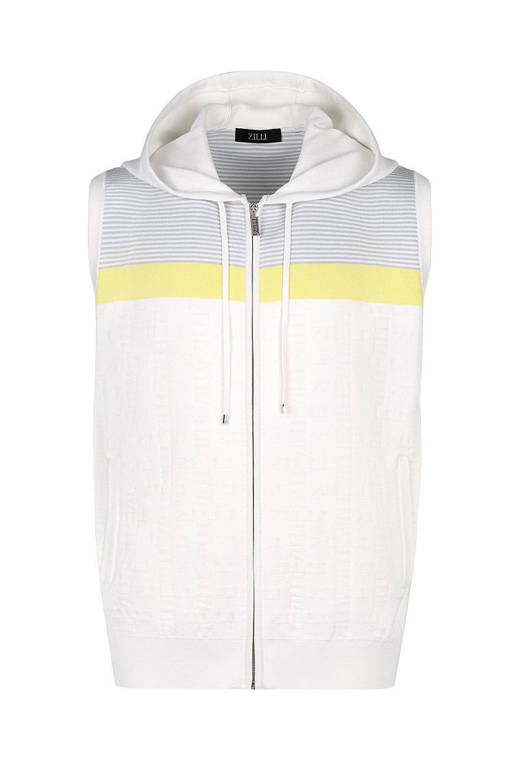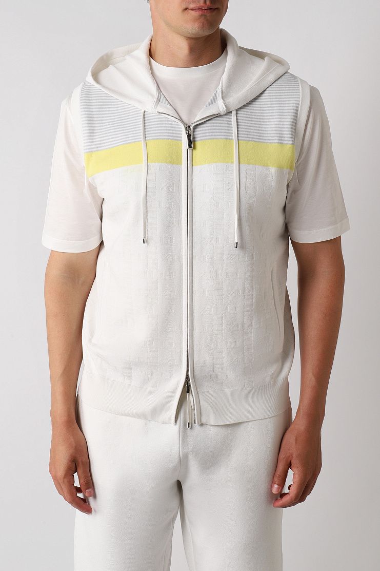 Жилет выполнен из сочетания прочного шелка и мягкого хлопка. Такой материал отлично пропускает воздух и впитывает влагу, благодаря чему жилет идеально подходит для занятий спортом. Двухзамковая молния и капюшон обеспечивают необходимую спортивную функциональность, а жаккардовый узор ZILLI в тон по всей поверхности и металлические наконечники шнурка с логотипом создают фирменный акцент. Сочетайте с соответствующими шортами и белыми кроссовками для создания комплекта.